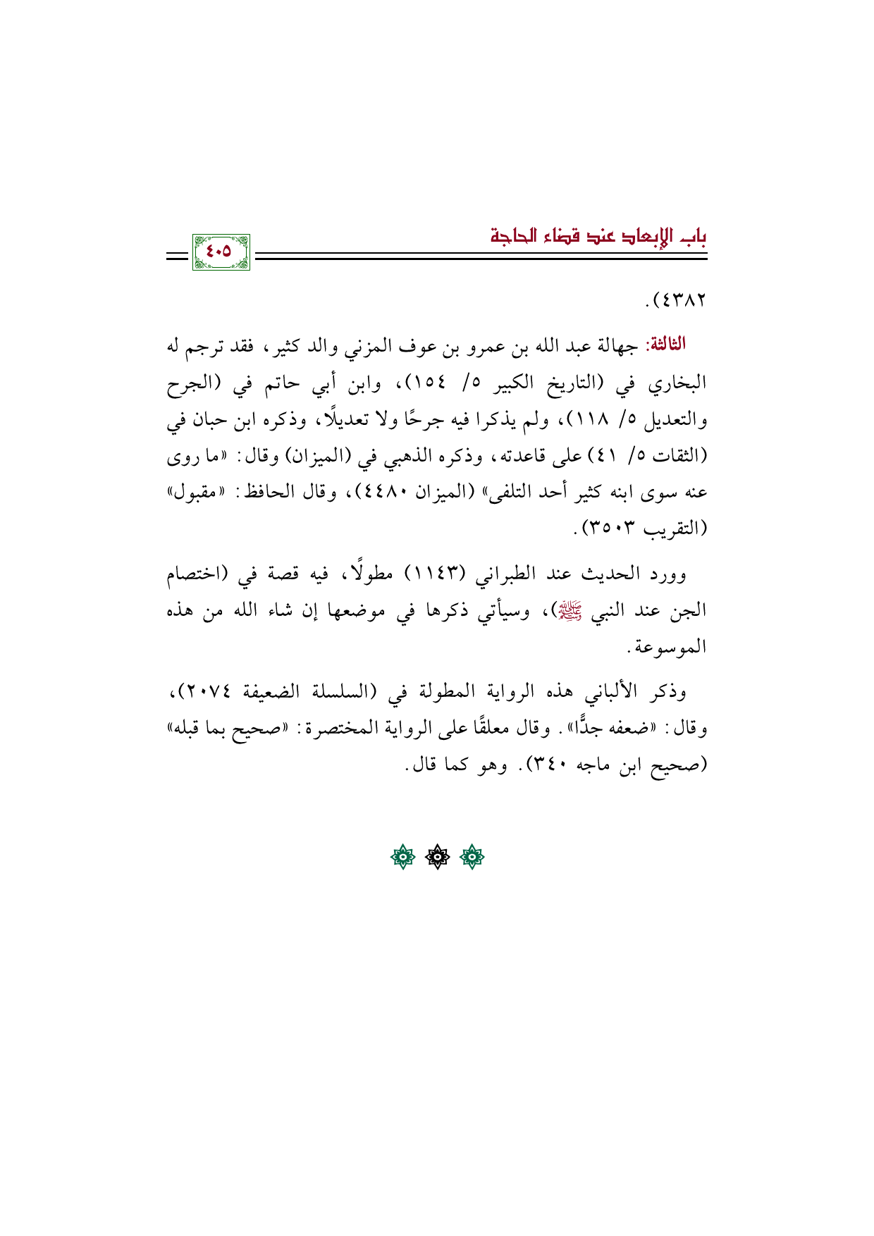 الثالثة: جهالة عبد الله بن عمرو بن عوف المزني والد كثير، فقد ترجم له البخاري في (التاريخ الكبير ٥/ ١٥٤)، وابن أبي حاتم في (الجرح والتعديل ٥/ ١١٨)، ولم يذكرا فيه جرحًا ولا تعديلًا، وذكره ابن حبان في (الثقات ٥/ ٤١) على قاعدته، وذكره الذهبي في (الميزان) وقال: "ما روى عنه سوى ابنه كثير أحد التلفى" (الميزان ٤٤٨٠)، وقال الحافظ: "مقبول" (التقريب ٣٥٠٣).