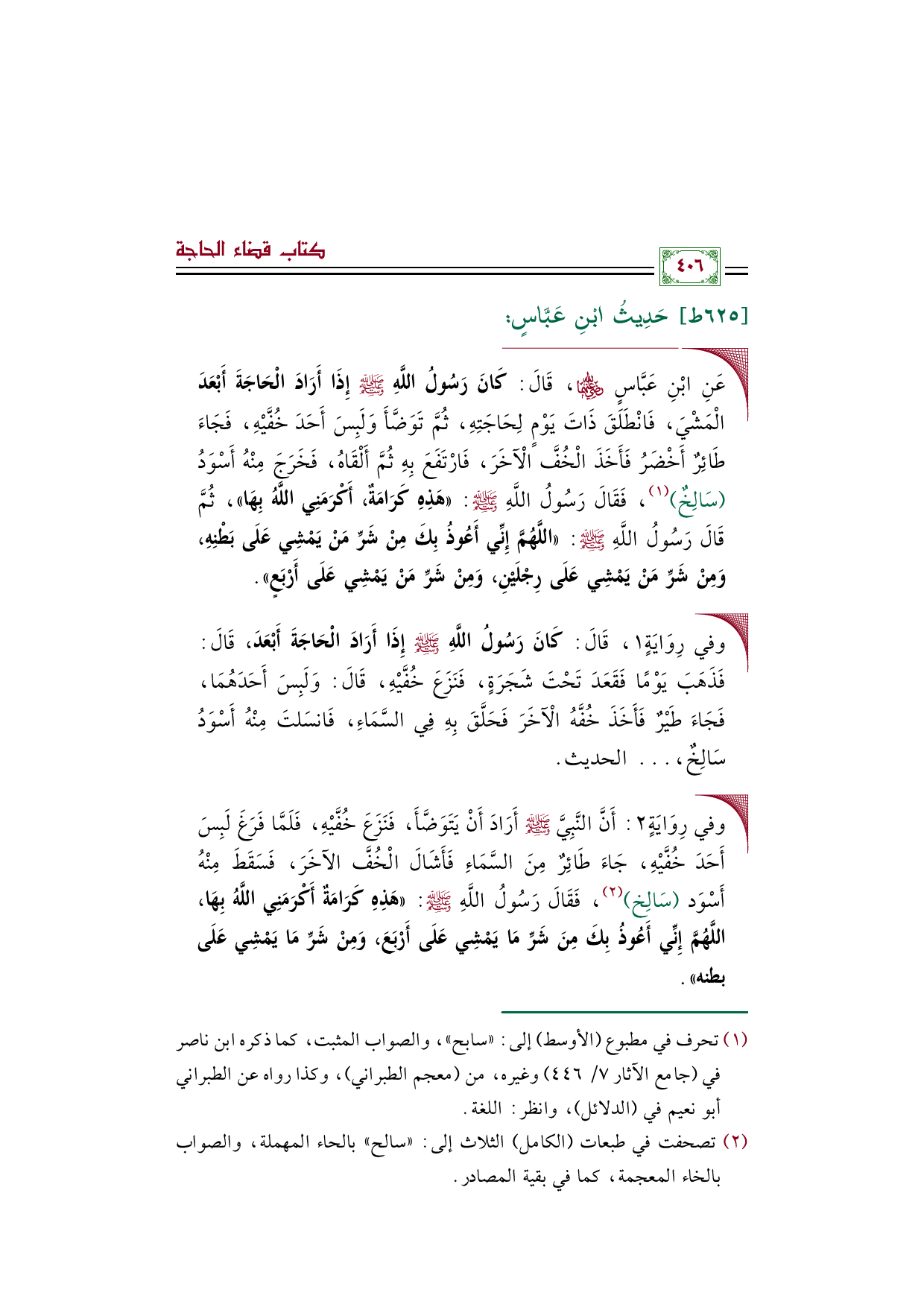 ◼ عَنِ ابْنِ عَبَّاسٍ رضي الله عنهما، قَالَ: كَانَ رَسُولُ اللَّهِ صلى الله عليه وسلم إِذَا أَرَادَ الْحَاجَةَ أَبْعَدَ الْمَشْيَ، فَانْطَلَقَ ذَاتَ يَوْمٍ لِحَاجَتِهِ، ثُمَّ تَوَضَّأَ وَلَبِسَ أَحَدَ خُفَّيْهِ، فَجَاءَ طَائِرٌ أَخْضَرُ فَأَخَذَ الْخُفَّ الْآخَرَ، فَارْتَفَعَ بِهِ ثُمَّ أَلْقَاهُ، فَخَرَجَ مِنْهُ أَسْوَدُ (سَالِخٌ) (¬١)، فَقَالَ رَسُولُ اللَّهِ صلى الله عليه وسلم: «هَذِهِ كَرَامَةٌ، أَكْرَمَنِي اللَّهُ بِهَا»، ثُمَّ قَالَ رَسُولُ اللَّهِ صلى الله عليه وسلم: «اللَّهُمَّ إِنِّي أَعُوذُ بِكَ مِنْ شَرِّ مَنْ يَمْشِي عَلَى بَطْنِهِ، وَمِنْ شَرِّ مَنْ يَمْشِي عَلَى رِجْلَيْنِ، وَمِنْ شَرِّ مَنْ يَمْشِي عَلَى أَرْبَعٍ».