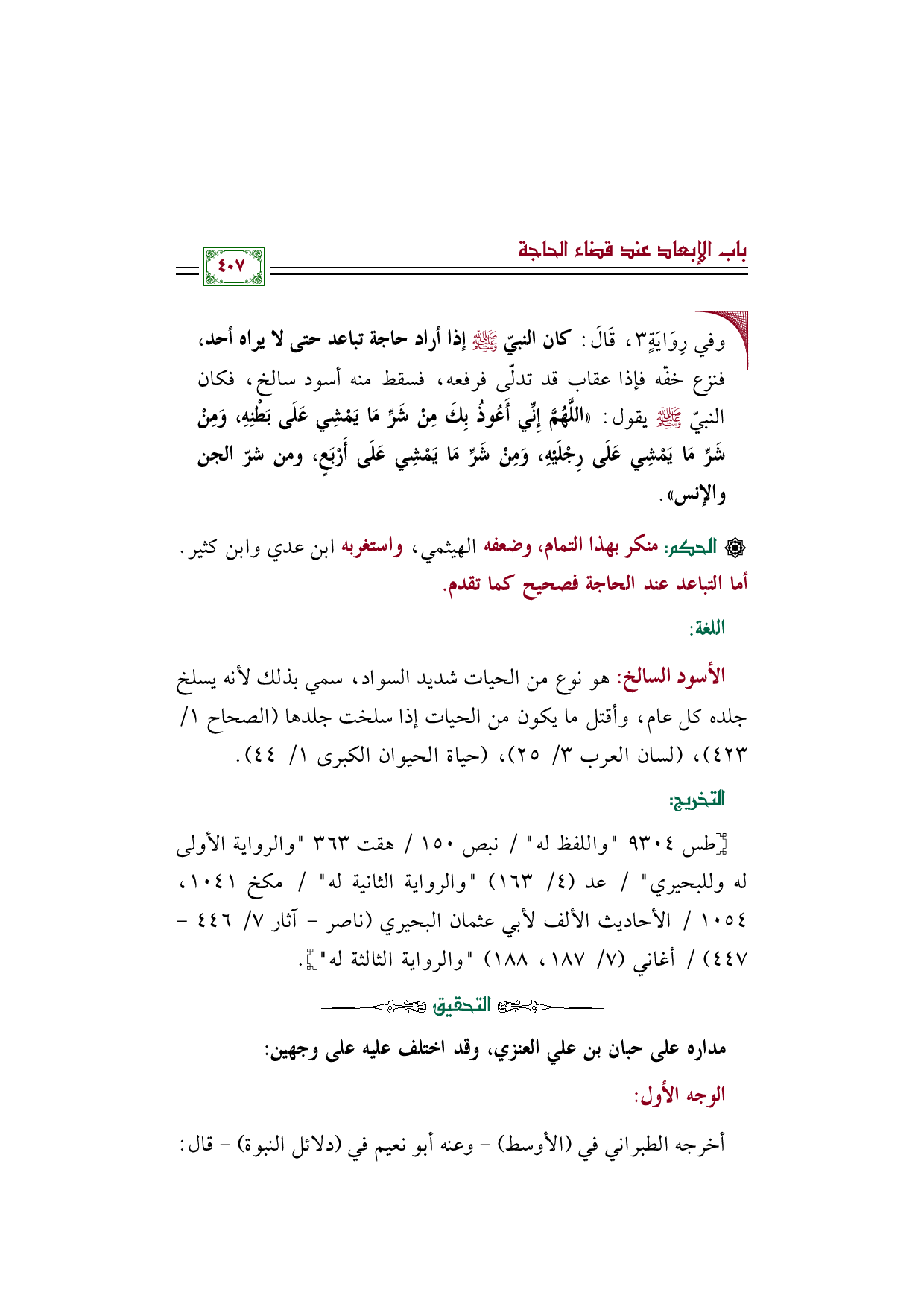 •وفي رِوَايَةٍ ٣، قَالَ: كان النبيّ صلّى الله عليه وسلّم إذا أراد حاجة تباعد حتى لا يراه أحد، فنزع خفّه فإذا عقاب قد تدلّى فرفعه، فسقط منه أسود سالخ، فكان النبيّ صلّى الله عليه وسلّم يقول: «اللَّهُمَّ إِنِّي أَعُوذُ بِكَ مِنْ شَرِّ مَا يَمْشِي عَلَى بَطْنِهِ، وَمِنْ شَرِّ مَا يَمْشِي عَلَى رِجْلَيْهِ، وَمِنْ شَرِّ مَا يَمْشِي عَلَى أَرْبَعٍ، ومن شرّ الجن والإنس».