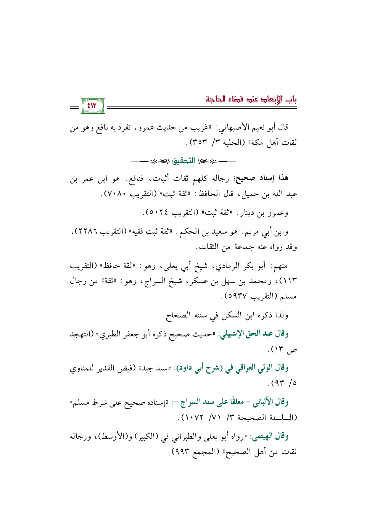 وقال الألباني - معلقًا على سند السراج -: "إسناده صحيح على شرط مسلم" (السلسلة الصحيحة ٣/ ٧١/ ١٠٧٢).
