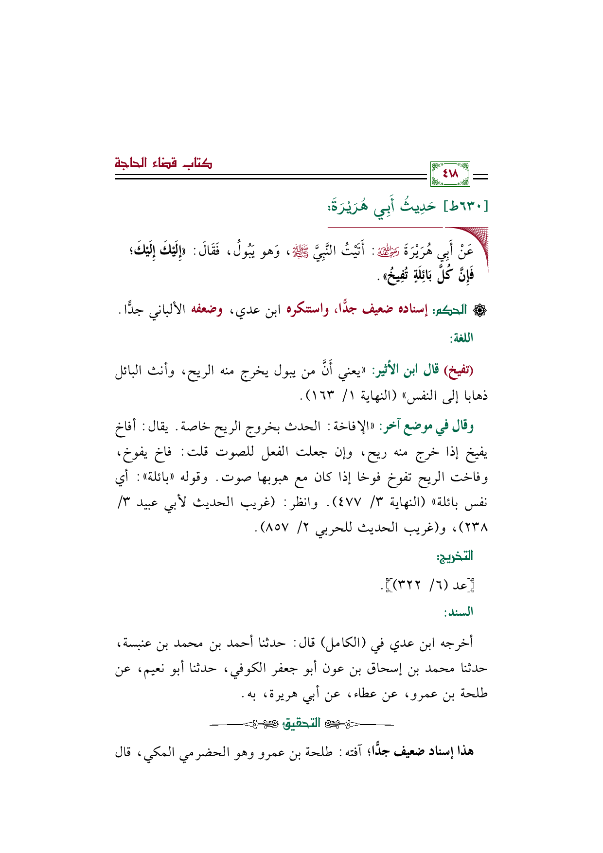 أخرجه ابن عدي في (الكامل) قال: حدثنا أحمد بن محمد بن عنبسة، حدثنا محمد بن إسحاق بن عون أبو جعفر الكوفي، حدثنا أبو نعيم، عن طلحة بن عمرو، عن عطاء، عن أبي هريرة، به.