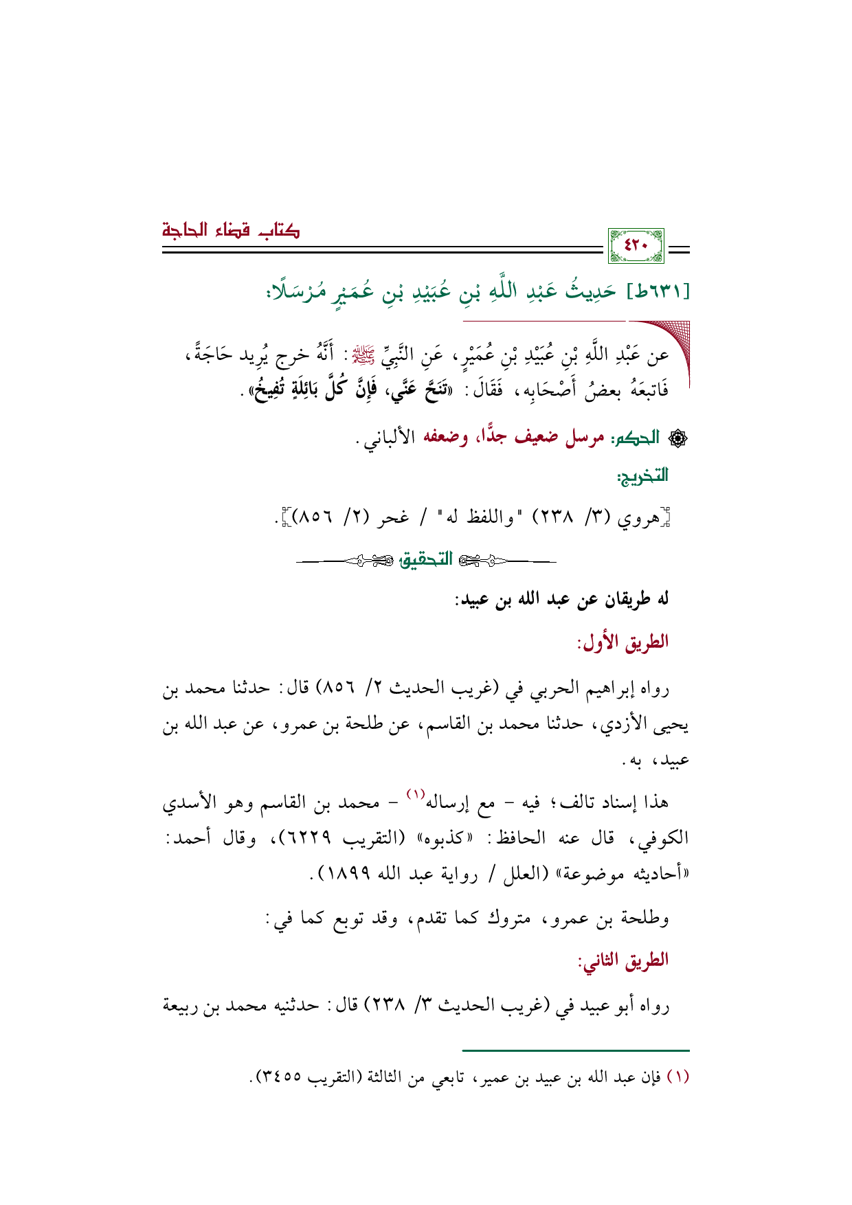 رواه إبراهيم الحربي في (غريب الحديث ٢/ ٨٥٦) قال: حدثنا محمد بن يحيى الأزدي، حدثنا محمد بن القاسم، عن طلحة بن عمرو، عن عبد الله بن عبيد، به.