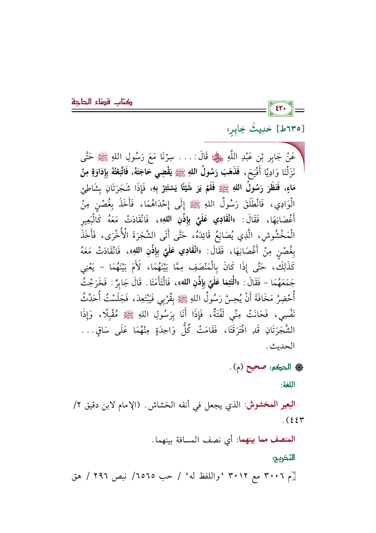 ◼ عَنْ جَابِر بْن عَبْدِ اللَّهِ رضي الله عنهما قَالَ: ... سِرْنَا مَعَ رَسُولِ اللهِ صَلَّى اللهُ عَلَيْهِ وَسَلَّمَ حَتَّى نَزَلْنَا وَادِيًا أَفْيَحَ، فَذَهَبَ رَسُولُ اللهِ صَلَّى اللهُ عَلَيْهِ وَسَلَّمَ يَقْضِي حَاجَتَهُ، فَاتَّبَعْتُهُ بِإِدَاوَةٍ مِنْ مَاءٍ، فَنَظَرَ رَسُولُ اللهِ صَلَّى اللهُ عَلَيْهِ وَسَلَّمَ فَلَمْ يَرَ شَيْئًا يَسْتَتِرُ بِهِ، فَإِذَا شَجَرَتَانِ بِشَاطِئِ الْوَادِي، فَانْطَلَقَ رَسُولُ اللهِ صَلَّى اللهُ عَلَيْهِ وَسَلَّمَ إِلَى إِحْدَاهُمَا، فَأَخَذَ بِغُصْنٍ مِنْ أَغْصَانِهَا، فَقَالَ: ((انْقَادِي عَلَيَّ بِإِذْنِ اللهِ))، فَانْقَادَتْ مَعَهُ كَالْبَعِيرِ الْمَخْشُوشِ، الَّذِي يُصَانِعُ قَائِدَهُ، حَتَّى أَتَى الشَّجَرَةَ الْأُخْرَى، فَأَخَذَ بِغُصْنٍ مِنْ أَغْصَانِهَا، فَقَالَ: ((انْقَادِي عَلَيَّ بِإِذْنِ اللهِ))، فَانْقَادَتْ مَعَهُ كَذَلِكَ، حَتَّى إِذَا كَانَ بِالْمَنْصَفِ مِمَّا بَيْنَهُمَا، لَأَمَ بَيْنَهُمَا - يَعْنِي جَمَعَهُمَا - فَقَالَ: ((الْتَئِمَا عَلَيَّ بِإِذْنِ الله))، فَالْتَأَمَتَا. قَالَ جَابِرٌ: فَخَرَجْتُ أُحْضِرُ مَخَافَةَ أَنْ يُحِسَّ رَسُولُ اللهِ صَلَّى اللهُ عَلَيْهِ وَسَلَّمَ بِقُرْبِي فَيَبْتَعِدَ، فَجَلَسْتُ أُحَدِّثُ نَفْسِي، فَحَانَتْ مِنِّي لَفْتَةٌ، فَإِذَا أَنَا بِرَسُولِ اللهِ صَلَّى اللهُ عَلَيْهِ وَسَلَّمَ مُقْبِلًا، وَإِذَا الشَّجَرَتَانِ قَدِ افْتَرَقَتَا، فَقَامَتْ كُلُّ وَاحِدَةٍ مِنْهُمَا عَلَى سَاقٍ ... الحديث.