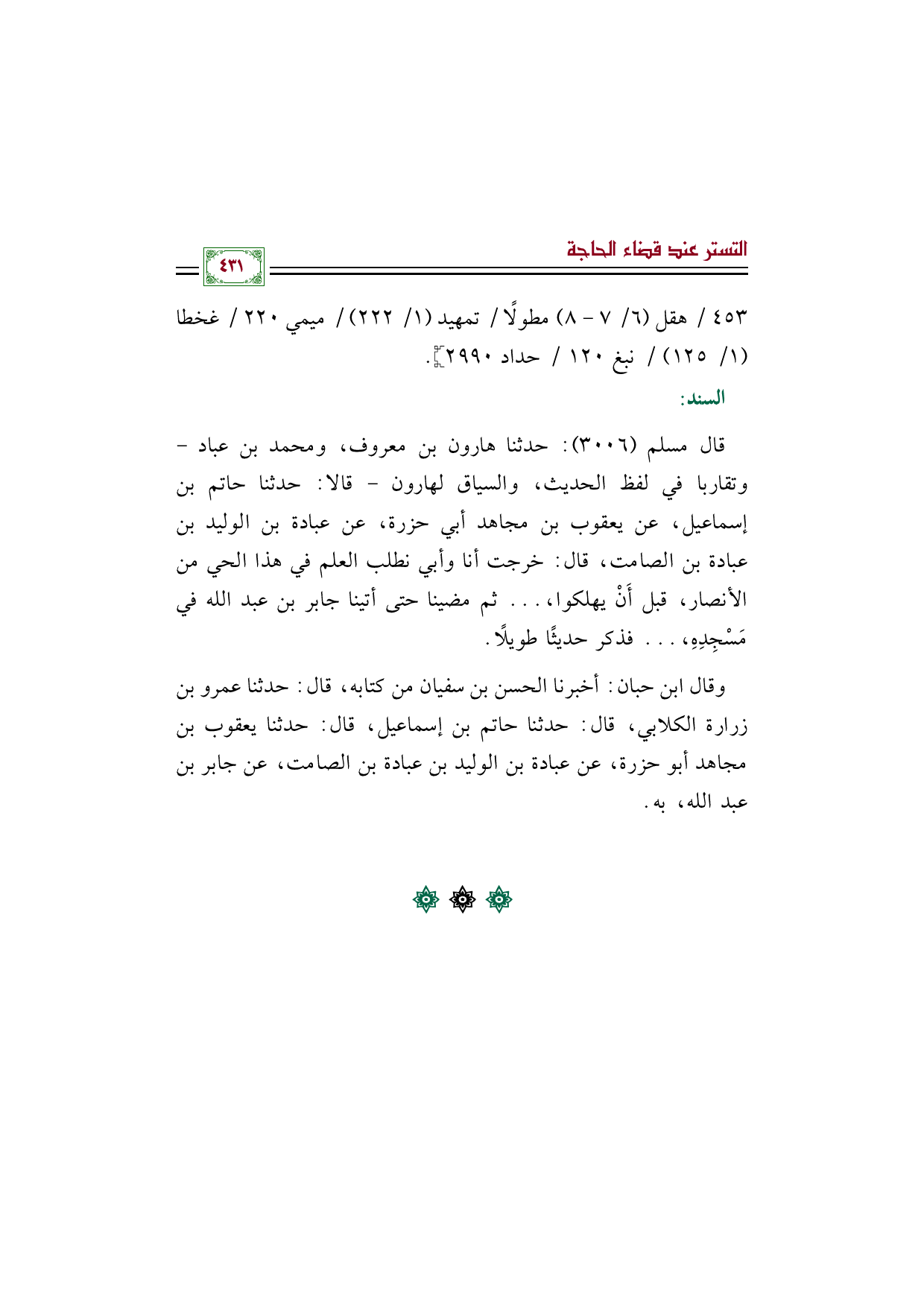 قال مسلم (٣٠٠٦): حدثنا هارون بن معروف، ومحمد بن عباد - وتقاربا في لفظ الحديث، والسياق لهارون - قالا: حدثنا حاتم بن إسماعيل، عن يعقوب بن مجاهد أبي حزرة، عن عبادة بن الوليد بن عبادة بن الصامت، قال: خرجت أنا وأبي نطلب العلم في هذا الحي من الأنصار، قبل أَنْ يهلكوا، ... ثم مضينا حتى أتينا جابر بن عبد الله في مَسْجِدِهِ، ... فذكر حديثًا طويلًا.