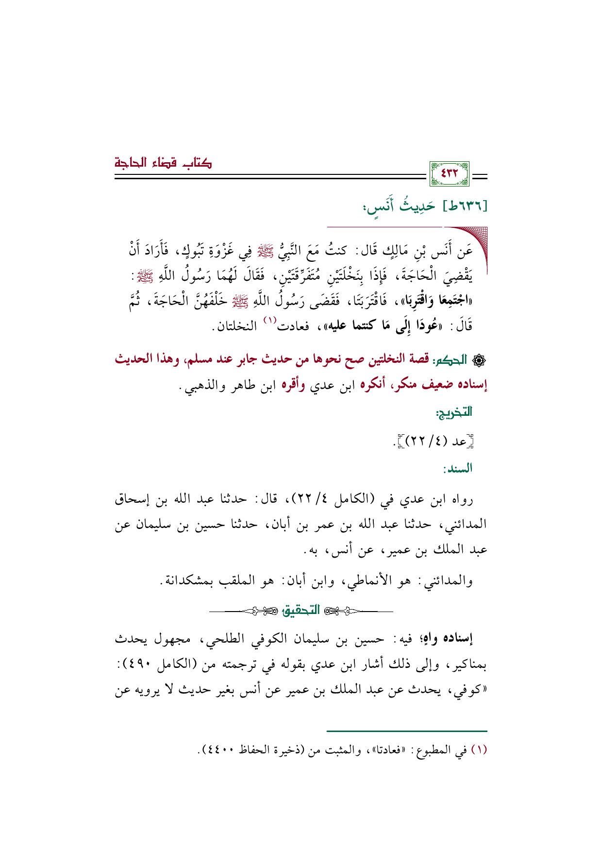 رواه ابن عدي في (الكامل ٤/ ٢٢)، قال: حدثنا عبد الله بن إسحاق المدائني، حدثنا عبد الله بن عمر بن أبان، حدثنا حسين بن سليمان عن عبد الملك بن عمير، عن أنس، به.