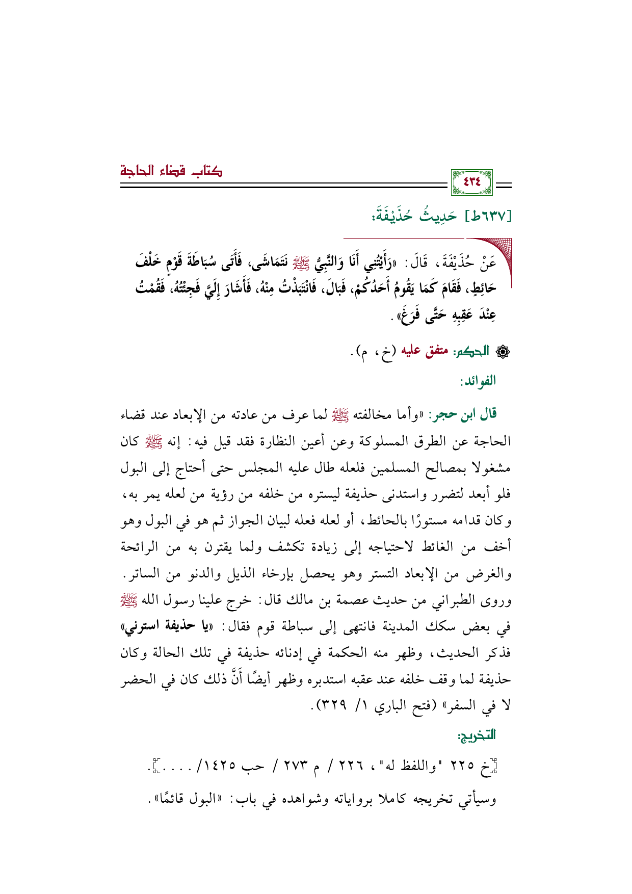 قال ابن حجر: "وأما مخالفته صلى الله عليه وسلم لما عرف من عادته من الإبعاد عند قضاء الحاجة عن الطرق المسلوكة وعن أعين النظارة فقد قيل فيه: إنه صلى الله عليه وسلم كان مشغولا بمصالح المسلمين فلعله طال عليه المجلس حتى أحتاج إلى البول فلو أبعد لتضرر واستدنى حذيفة ليستره من خلفه من رؤية من لعله يمر به، وكان قدامه مستورًا بالحائط، أو لعله فعله لبيان الجواز ثم هو في البول وهو أخف من الغائط لاحتياجه إلى زيادة تكشف ولما يقترن به من الرائحة والغرض من الإبعاد التستر وهو يحصل بإرخاء الذيل والدنو من الساتر. وروى الطبراني من حديث عصمة بن مالك قال: خرج علينا رسول الله صلى الله عليه وسلم في بعض سكك المدينة فانتهى إلى سباطة قوم فقال: «يا حذيفة استرني» فذكر الحديث، وظهر منه الحكمة في إدنائه حذيفة في تلك الحالة وكان حذيفة لما وقف خلفه عند عقبه استدبره وظهر أيضًا أَنَّ ذلك كان في الحضر لا في السفر" (فتح الباري ١/ ٣٢٩).