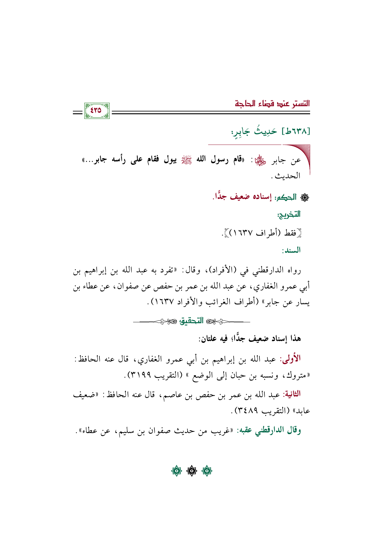 رواه الدارقطني في (الأفراد)، وقال: "تفرد به عبد الله بن إبراهيم بن أبي عمرو الغفاري، عن عبد الله بن عمر بن حفص عن صفوان، عن عطاء بن يسار عن جابر" (أطراف الغرائب والأفراد ١٦٣٧).