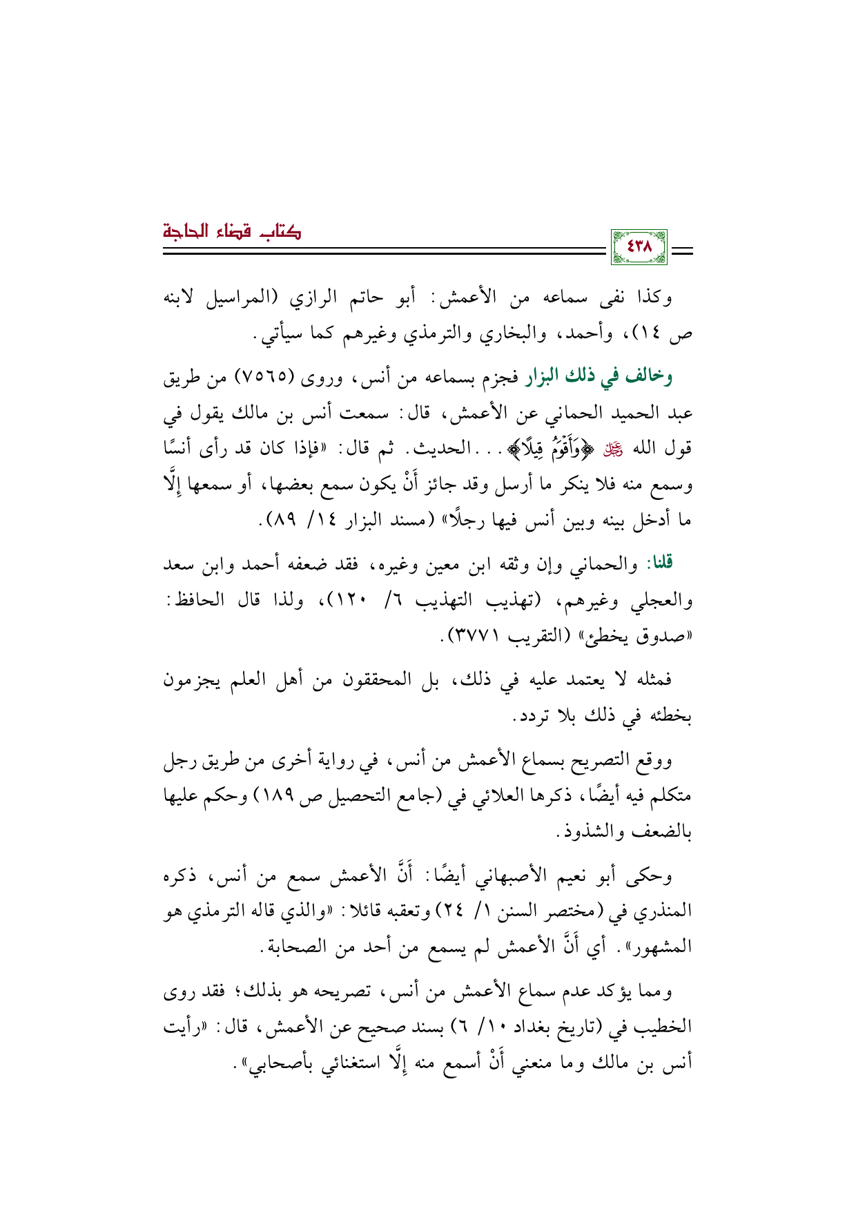 ومما يؤكد عدم سماع الأعمش من أنس، تصريحه هو بذلك؛ فقد روى الخطيب في (تاريخ بغداد ١٠/ ٦) بسند صحيح عن الأعمش، قال: "رأيت أنس بن مالك وما منعني أَنْ أسمع منه إِلَّا استغنائي بأصحابي".