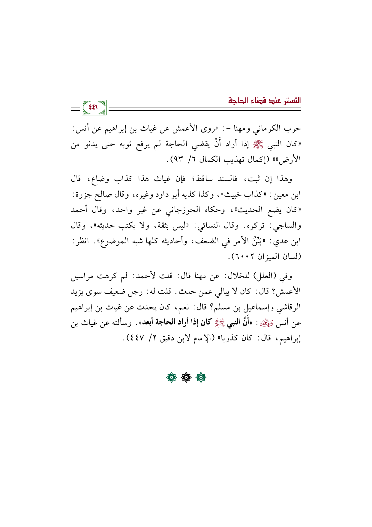 حرب الكرماني ومهنا -: "روى الأعمش عن غياث بن إبراهيم عن أنس: «كان النبي صلى الله عليه وسلم إذا أراد أَنْ يقضي الحاجة لم يرفع ثوبه حتى يدنو من الأرض» " (إكمال تهذيب الكمال ٦/ ٩٣).