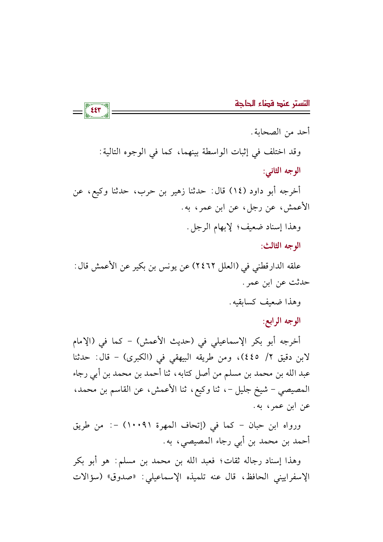 علقه الدارقطني في (العلل ٢٤٦٢) عن يونس بن بكير عن الأعمش قال: حدثت عن ابن عمر.
