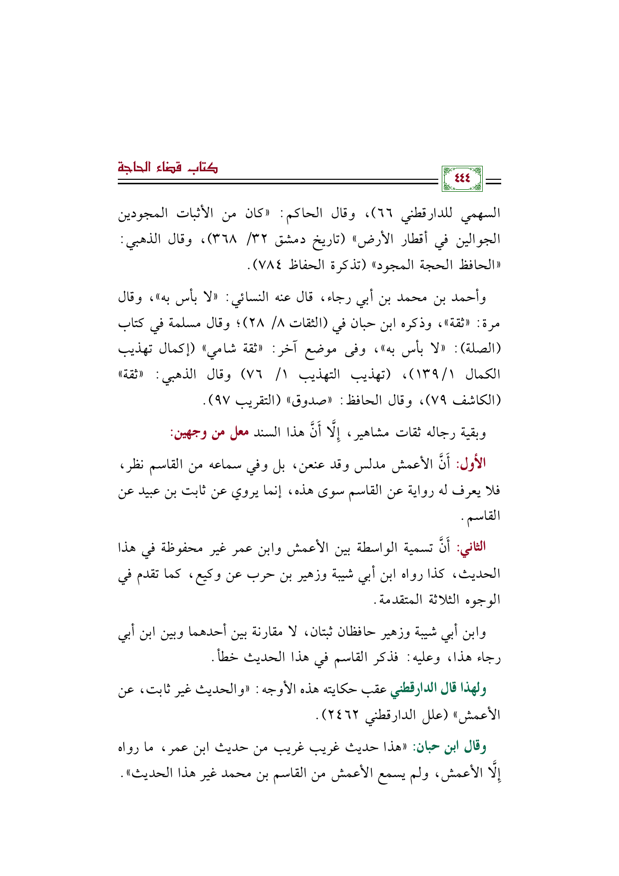 وقال ابن حبان: "هذا حديث غريب غريب من حديث ابن عمر، ما رواه إِلَّا الأعمش، ولم يسمع الأعمش من القاسم بن محمد غير هذا الحديث".