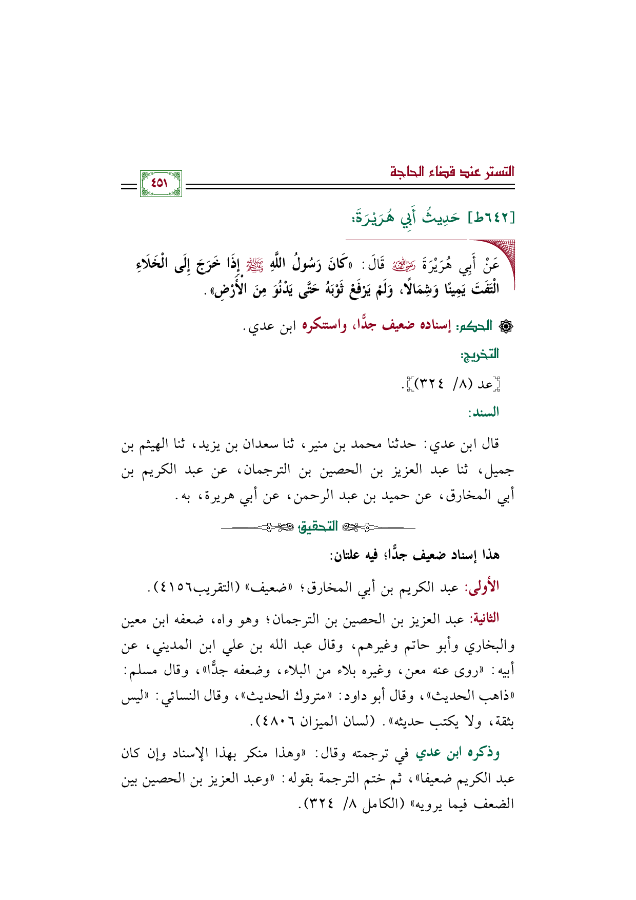 الثانية: عبد العزيز بن الحصين بن الترجمان؛ وهو واه، ضعفه ابن معين والبخاري وأبو حاتم وغيرهم، وقال عبد الله بن علي ابن المديني، عن أبيه: "روى عنه معن، وغيره بلاء من البلاء، وضعفه جدًّا"، وقال مسلم: "ذاهب الحديث"، وقال أبو داود: "متروك الحديث"، وقال النسائي: "ليس بثقة، ولا يكتب حديثه". (لسان الميزان ٤٨٠٦).
