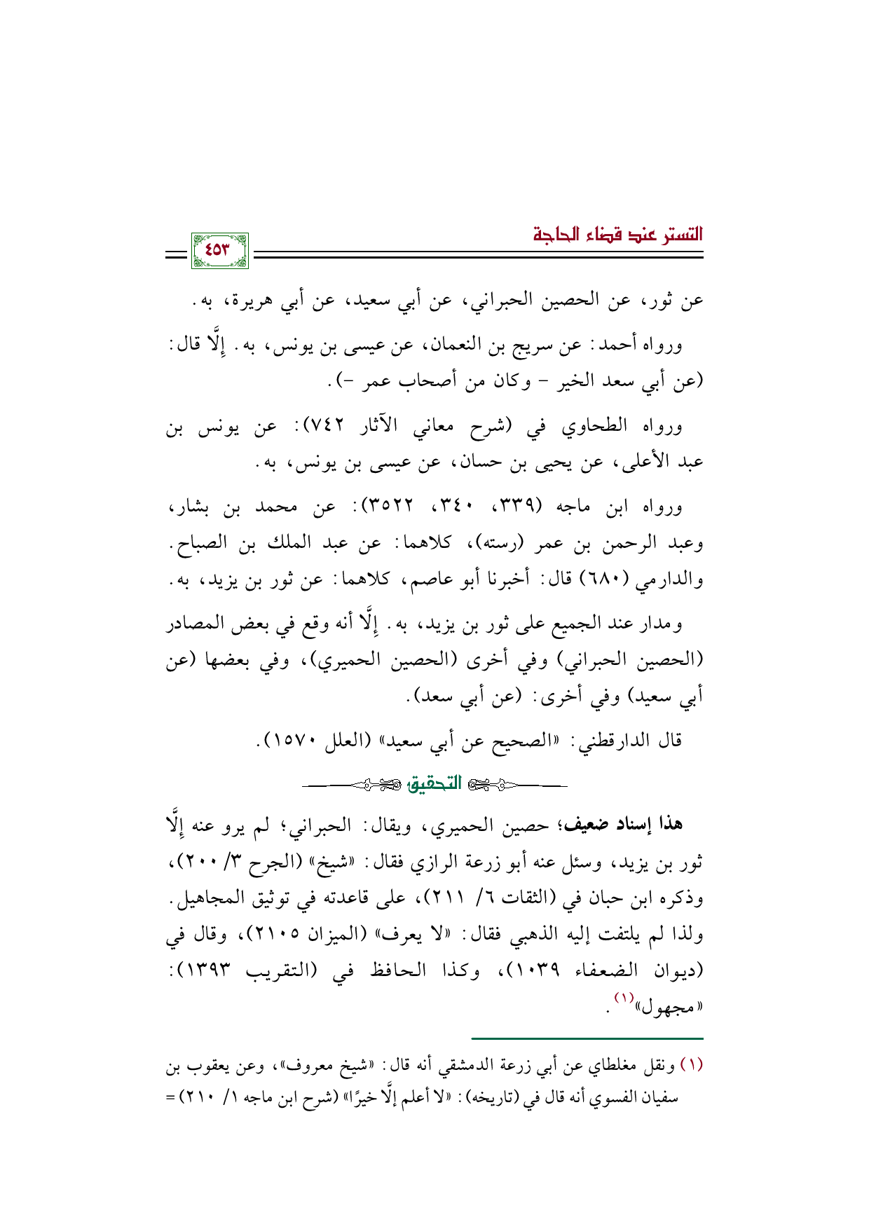 هذا إسناد ضعيف؛ حصين الحميري، ويقال: الحبراني؛ لم يرو عنه إِلَّا ثور بن يزيد، وسئل عنه أبو زرعة الرازي فقال: "شيخ" (الجرح ٣/ ٢٠٠)، وذكره ابن حبان في (الثقات ٦/ ٢١١)، على قاعدته في توثيق المجاهيل. ولذا لم يلتفت إليه الذهبي فقال: "لا يعرف" (الميزان ٢١٠٥)، وقال في (ديوان الضعفاء ١٠٣٩)، وكذا الحافظ في (التقريب ١٣٩٣): "مجهول" (¬١).