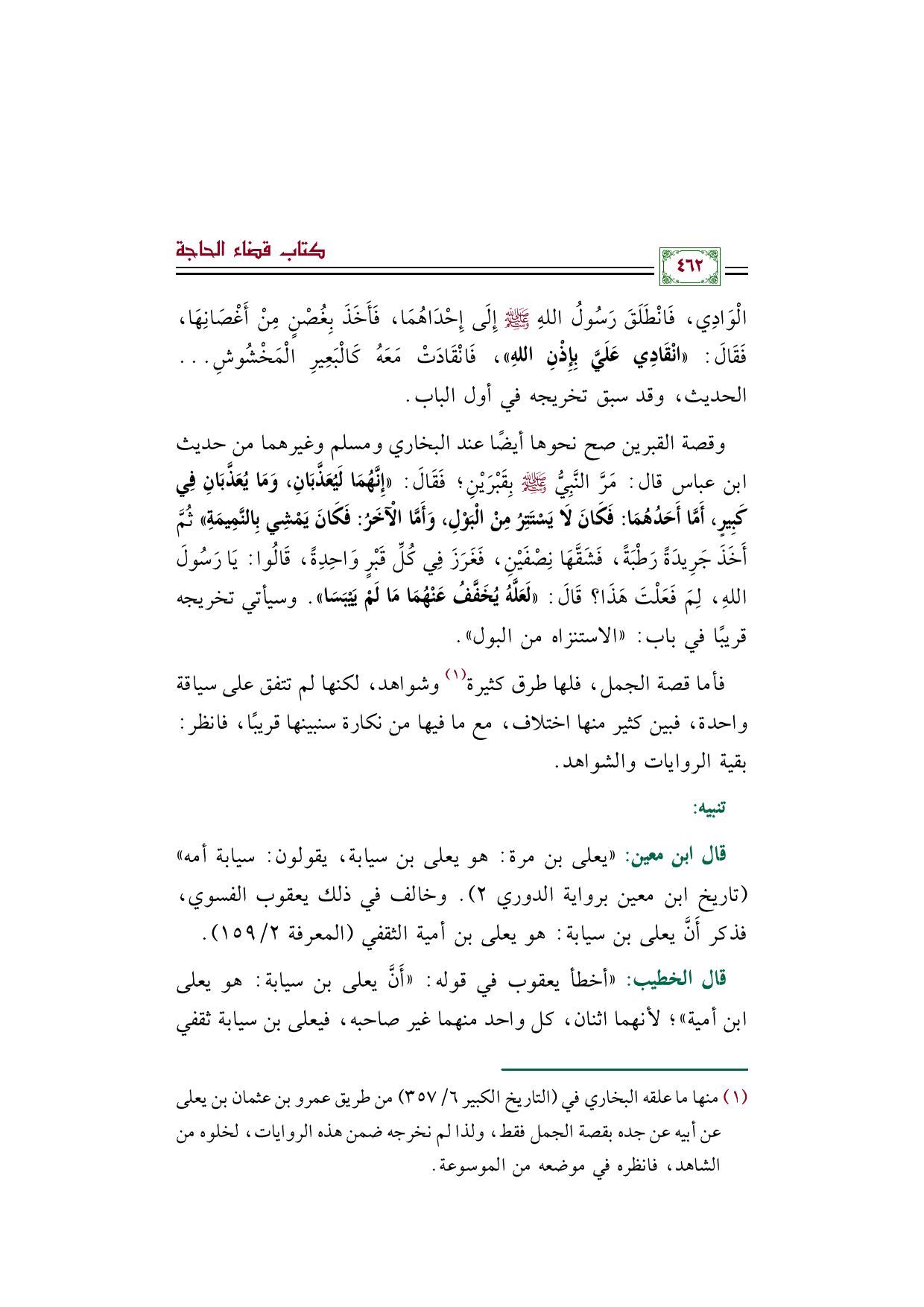 وقصة القبرين صح نحوها أيضًا عند البخاري ومسلم وغيرهما من حديث ابن عباس قال: مَرَّ النَّبِيُّ صلى الله عليه وسلم بِقَبْرَيْنِ؛ فَقَالَ: «إِنَّهُمَا لَيُعَذَّبَانِ، وَمَا يُعَذَّبَانِ فِي كَبِيرٍ، أَمَّا أَحَدُهُمَا: فَكَانَ لَا يَسْتَتِرُ مِنْ الْبَوْلِ، وَأَمَّا الْآخَرُ: فَكَانَ يَمْشِي بِالنَّمِيمَةِ» ثُمَّ أَخَذَ جَرِيدَةً رَطْبَةً، فَشَقَّهَا نِصْفَيْنِ، فَغَرَزَ فِي كُلِّ قَبْرٍ وَاحِدِةً، قَالُوا: يَا رَسُولَ اللهِ، لِمَ فَعَلْتَ هَذَا؟ قَالَ: «لَعَلَّهُ يُخَفَّفُ عَنْهُمَا مَا لَمْ يَيْبَسَا». وسيأتي تخريجه قريبًا في باب: "الاستنزاه من البول".