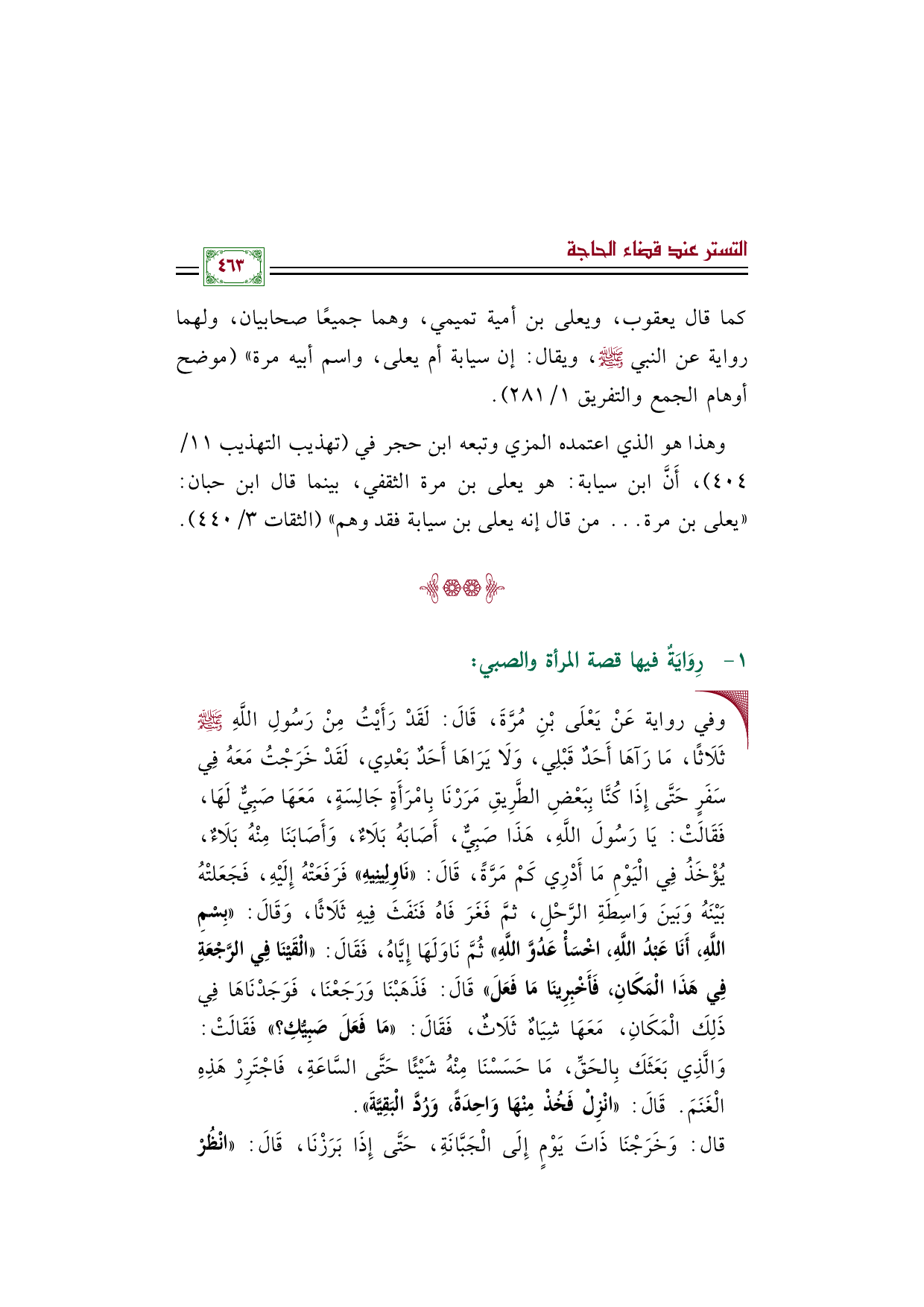 • وفي رواية عَنْ يَعْلَى بْنِ مُرَّةَ، قَالَ: لَقَدْ رَأَيْتُ مِنْ رَسُولِ اللَّهِ صَلَّى اللهُ عَلَيْهِ وَسَلَّمَ ثَلَاثًا، مَا رَآهَا أَحَدٌ قَبْلِي، وَلَا يَرَاهَا أَحَدٌ بَعْدِي، لَقَدْ خَرَجْتُ مَعَهُ فِي سَفَرٍ حَتَّى إِذَا كُنَّا بِبَعْضِ الطَّرِيقِ مَرَرْنَا بِامْرَأَةٍ جَالِسَةٍ، مَعَهَا صَبِيٌّ لَهَا، فَقَالَتْ: يَا رَسُولَ اللَّهِ، هَذَا صَبِيٌّ، أَصَابَهُ بَلَاءٌ، وَأَصَابَنَا مِنْهُ بَلَاءٌ، يُؤْخَذُ فِي الْيَوْمِ مَا أَدْرِي كَمْ مَرَّةً، قَالَ: «نَاوِلِينِيهِ» فَرَفَعَتْهُ إِلَيْهِ، فَجَعَلتْهُ بَيْنَهُ وَبَينَ وَاسِطَةِ الرَّحْلِ، ثمَّ فَغَرَ فَاهُ فَنَفَثَ فِيهِ ثَلَاثًا، وَقَالَ: «بِسْمِ اللَّهِ، أَنَا عَبْدُ اللَّهِ، اخْسَأْ عَدُوَّ اللَّهِ» ثُمَّ نَاوَلَهَا إِيَّاهُ، فَقَالَ: «الْقَيْنَا فِي الرَّجْعَةِ فِي هَذَا الْمَكَانِ، فَأَخْبِرِينَا مَا فَعَلَ» قَالَ: فَذَهَبْنَا وَرَجَعْنَا، فَوَجَدْنَاهَا فِي ذَلِكَ الْمَكَانِ، مَعَهَا شِيَاهٌ ثَلَاثٌ، فَقَالَ: «مَا فَعَلَ صَبِيُّكِ؟» فَقَالَتْ: وَالَّذِي بَعَثَكَ بِالحَقِّ، مَا حَسَسْنَا مِنْهُ شَيْئًا حَتَّى السَّاعَةِ، فَاجْتَرِرْ هَذِهِ الْغَنَمَ. قَالَ: «انْزِلْ فَخُذْ مِنْهَا وَاحِدَةً، وَرُدَّ الْبَقِيَّةَ».