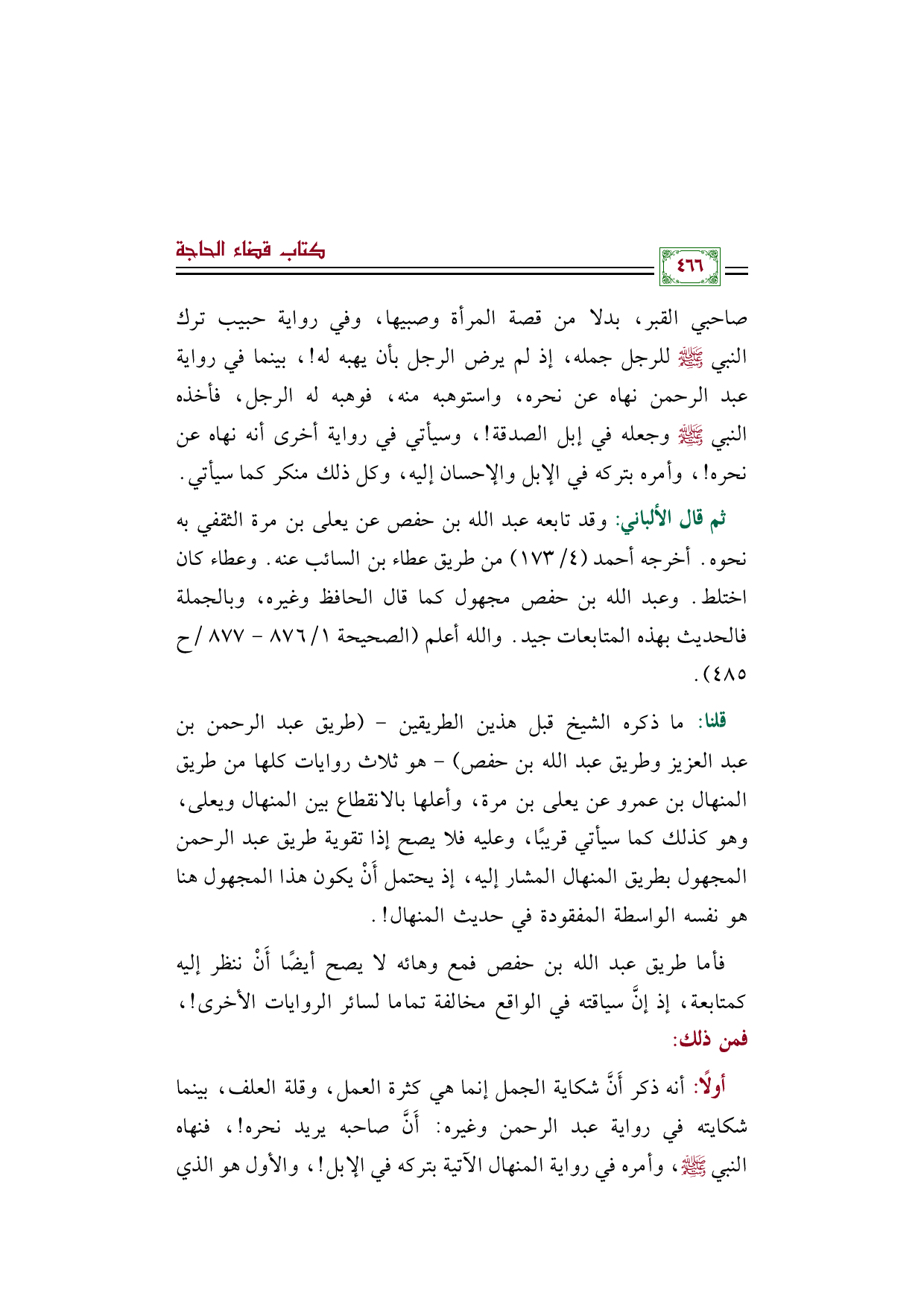 صاحبي القبر، بدلا من قصة المرأة وصبيها، وفي رواية حبيب ترك النبي صلى الله عليه وسلم للرجل جمله، إذ لم يرض الرجل بأن يهبه له! ، بينما في رواية عبد الرحمن نهاه عن نحره، واستوهبه منه، فوهبه له الرجل، فأخذه النبي صلى الله عليه وسلم وجعله في إبل الصدقة! ، وسيأتي في رواية أخرى أنه نهاه عن نحره! ، وأمره بتركه في الإبل والإحسان إليه، وكل ذلك منكر كما سيأتي.