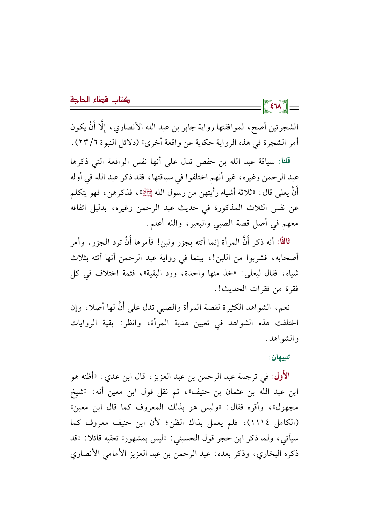 الأول: في ترجمة عبد الرحمن بن عبد العزيز، قال ابن عدي: "أظنه هو ابن عبد الله بن عثمان بن حنيف"، ثم نقل قول ابن معين أنه: "شيخ مجهول"، وأقره فقال: "وليس هو بذلك المعروف كما قال ابن معين" (الكامل ١١١٤)، فلم يعمل بذاك الظن؛ لأن ابن حنيف معروف كما سيأتي، ولما ذكر ابن حجر قول الحسيني: "ليس بمشهور" تعقبه قائلا: "قد ذكره البخاري، وذكر بعده: عبد الرحمن بن عبد العزيز الأمامي الأنصاري