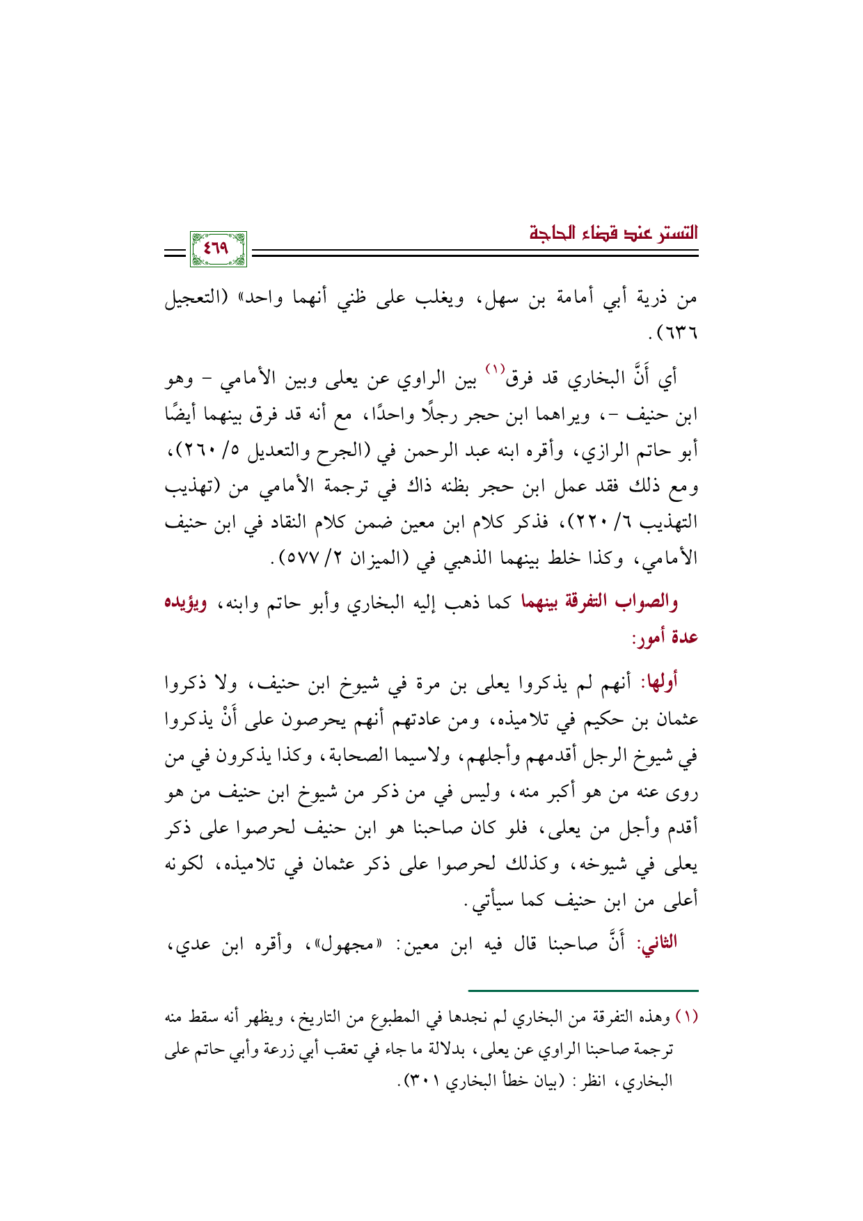 أي أَنَّ البخاري قد فرق (¬١) بين الراوي عن يعلى وبين الأمامي - وهو ابن حنيف -، ويراهما ابن حجر رجلًا واحدًا، مع أنه قد فرق بينهما أيضًا أبو حاتم الرازي، وأقره ابنه عبد الرحمن في (الجرح والتعديل ٥/ ٢٦٠)، ومع ذلك فقد عمل ابن حجر بظنه ذاك في ترجمة الأمامي من (تهذيب التهذيب ٦/ ٢٢٠)، فذكر كلام ابن معين ضمن كلام النقاد في ابن حنيف الأمامي، وكذا خلط بينهما الذهبي في (الميزان ٢/ ٥٧٧).