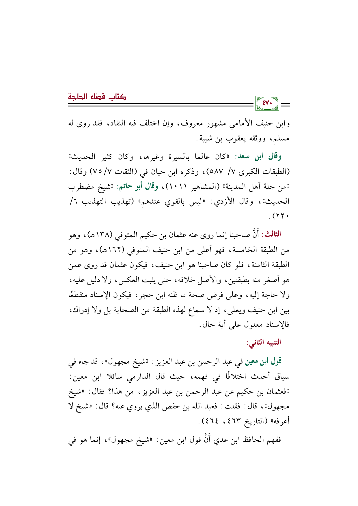 الثالث: أَنَّ صاحبنا إنما روى عنه عثمان بن حكيم المتوفي (١٣٨ هـ)، وهو من الطبقة الخامسة، فهو أعلى من ابن حنيف المتوفي (١٦٢ هـ)، وهو من الطبقة الثامنة، فلو كان صاحبنا هو ابن حنيف، فيكون عثمان قد روى عمن هو أصغر منه بطبقتين، والأصل خلافه، حتى يثبت العكس، ولا دليل عليه، ولا حاجة إليه، وعلى فرض صحة ما ظنه