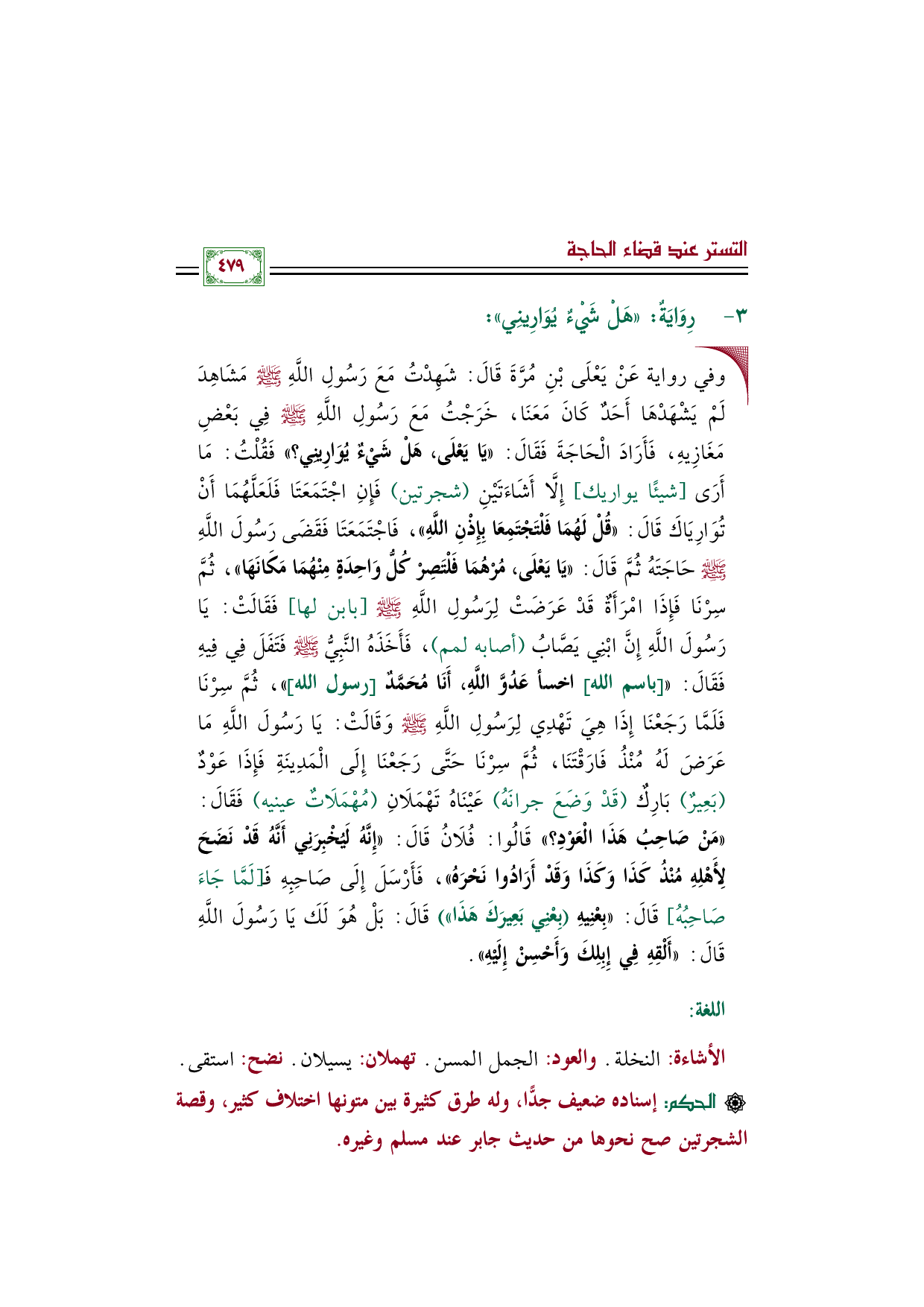 • وفي رواية عَنْ يَعْلَى بْنِ مُرَّةَ قَالَ: شَهِدْتُ مَعَ رَسُولِ اللَّهِ صَلَّى اللَّهُ عَلَيْهِ وَسَلَّمَ مَشَاهِدَ لَمْ يَشْهَدْهَا أَحَدٌ كَانَ مَعَنَا، خَرَجْتُ مَعَ رَسُولِ اللَّهِ صَلَّى اللَّهُ عَلَيْهِ وَسَلَّمَ فِي بَعْضِ مَغَازِيهِ، فَأَرَادَ الْحَاجَةَ فَقَالَ: «يَا يَعْلَى، هَلْ شَيْءٌ يُوَارِينِي؟» فَقُلْتُ: مَا أَرَى [شيئًا يواريك] إِلَّا أَشَاءَتَيْنِ (شجرتين) فَإِنِ اجْتَمَعَتَا فَلَعَلَّهُمَا أَنْ تُوَارِيَاكَ قَالَ: «قُلْ لَهُمَا فَلْتَجْتَمِعَا بِإِذْنِ اللَّهِ»، فَاجْتَمَعَتَا فَقَضَى رَسُولَ اللَّهِ صَلَّى اللَّهُ عَلَيْهِ وَسَلَّمَ حَاجَتَهُ ثُمَّ قَالَ: «يَا يَعْلَى، مُرْهُمَا فَلْتَصِرْ كُلُّ وَاحِدَةٍ مِنْهُمَا مَكَانَهَا»، ثُمَّ سِرْنَا فَإِذَا امْرَأَةٌ قَدْ عَرَضَتْ لِرَسُولِ اللَّهِ صَلَّى اللَّهُ عَلَيْهِ وَسَلَّمَ [بابن لها] فَقَالَتْ: يَا رَسُولَ اللَّهِ إِنَّ ابْنِي يَصَّابُ (أصابه لمم)، فَأَخَذَهُ النَّبِيُّ صَلَّى اللَّهُ عَلَيْهِ وَسَلَّمَ فَتَفَلَ فِي فِيهِ فَقَالَ: «[باسم الله] اخسأ عَدُوَّ اللَّهِ، أَنَا مُحَمَّدٌ [رسول الله]»، ثُمَّ سِرْنَا فَلَمَّا رَجَعْنَا إِذَا هِيَ تَهْدِي لِرَسُولِ اللَّهِ صَلَّى اللَّهُ عَلَيْهِ وَسَلَّمَ وَقَالَتْ: يَا رَسُولَ اللَّهِ مَا عَرَضَ لَهُ مُنْذُ فَارَقْتَنَا، ثُمَّ سِرْنَا حَتَّى رَجَعْنَا إِلَى الْمَدِينَةِ فَإِذَا عَوْدٌ (بَعِيرٌ) بَارِكٌ (قَدْ وَضَعَ جرانَهُ) عَيْنَاهُ تَهْمَلَانِ (مُهْمَلَاتٌ عينيه) فَقَالَ: «مَنْ صَاحِبُ هَذَا الْعَوْدِ؟» قَالُوا: فُلَانُ قَالَ: «إِنَّهُ لَيُخْبِرَنِي أَنَّهُ قَدْ نَضَحَ لِأَهْلِهِ مُنْذُ كَذَا وَكَذَا وَقَدْ أَرَادُوا نَحْرَهُ»، فَأَرْسَلَ إِلَى صَاحِبِهِ فَـ[لَمَّا جَاءَ صَاحِبُهُ] قَالَ: «بِعْنِيهِ (بِعْنِي بَعِيرَكَ هَذَا)» قَالَ: بَلْ هُوَ لَكَ يَا