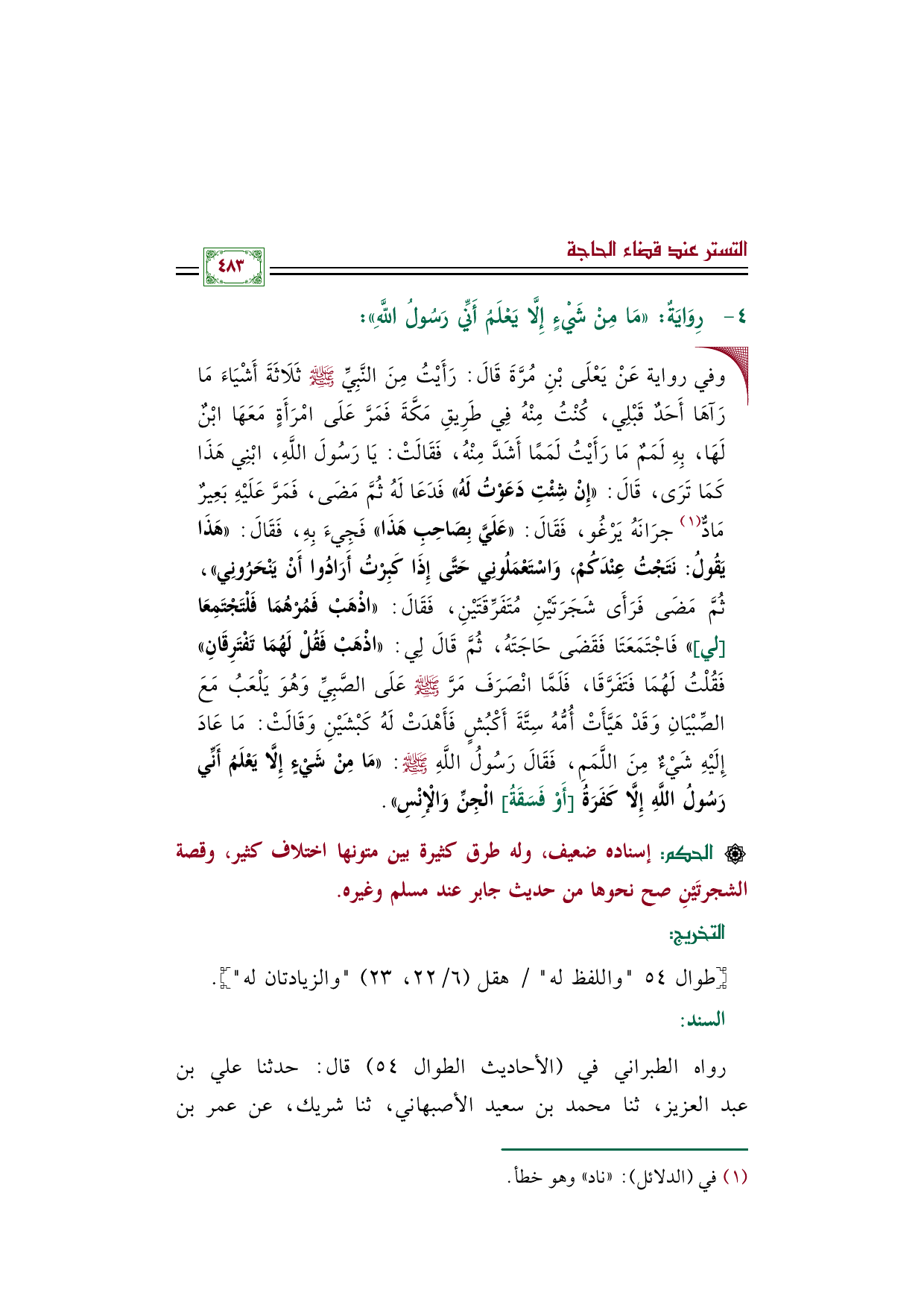[الحكم]: إسناده ضعيف، وله طرق كثيرة بين متونها اختلاف كثير، وقصة الشجرتَيْنِ صح نحوها من حديث جابر عند مسلم وغيره.