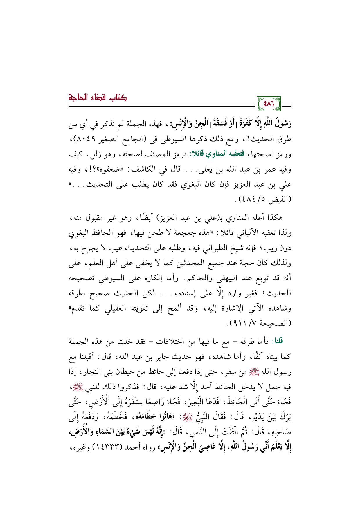 هكذا أعله المناوي بـ (علي بن عبد العزيز) أيضًا، وهو غير مقبول منه، ولذا تعقبه الألباني قائلا: "هذه جعجعة لا طحن فيها، فهو الحافظ البغوي دون ريب؛ فإنه شيخ الطبراني فيه، وطلبه على التحديث عيب لا يجرح به، ولذلك كان حجة عند جميع المحدثين كما لا يخفى على أهل العلم، على أنه قد توبع عند البيهقي والحاكم. وأما إنكاره على السيوطي تصحيحه للحديث؛ فغير وارد إِلَّا على إسناده، ... لكن الحديث صحيح بطرقه وشاهده الآتي الإشارة إليه، وقد ألمح إلى تقويته العقيلي كما تقدم" (الصحيحة ٧/ ٩١١).
