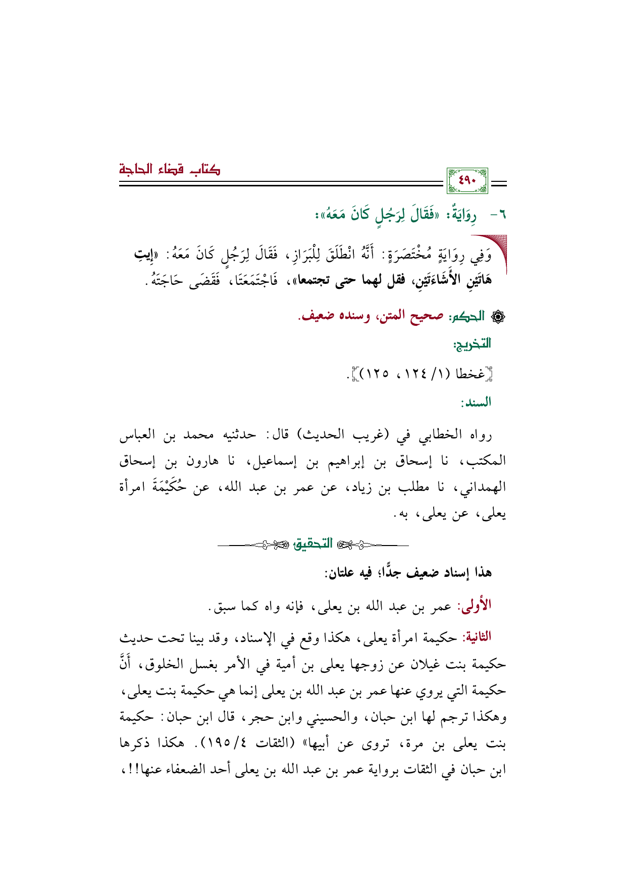 الثانية: حكيمة امرأة يعلى، هكذا وقع في الإسناد، وقد بينا تحت حديث حكيمة بنت غيلان عن زوجها يعلى بن أمية في الأمر بغسل الخلوق، أَنَّ حكيمة التي يروي عنها عمر بن عبد الله بن يعلى إنما هي حكيمة بنت يعلى، وهكذا ترجم لها ابن حبان، والحسيني وابن حجر، قال ابن حبان: حكيمة بنت يعلى بن مرة، تروى عن أبيها" (الثقات ٤/ ١٩٥). هكذا ذكرها ابن حبان في الثقات برواية عمر بن عبد الله بن يعلى أحد الضعفاء عنها!!،