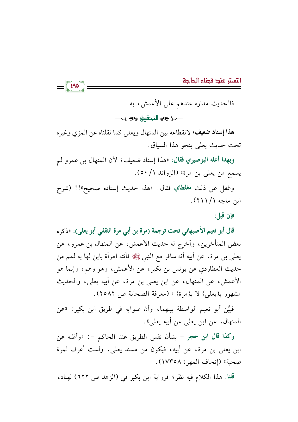 وكذا قال ابن حجر - بشأن نفس الطريق عند الحاكم -: "وأظنه عن ابن يعلى بن مرة، عن أبيه، فيكون من مسند يعلى، ولست أعرف لمرة صحبة" (إتحاف المهرة ١٧٣٥٨).