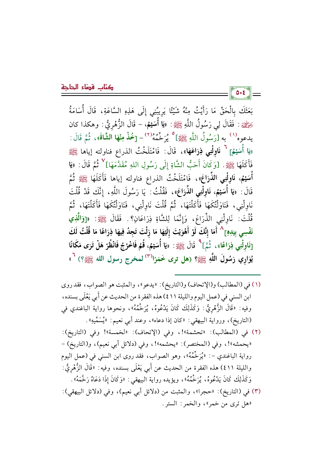 (¬٢) - في المطالب: "تحشمة"! ، وفي الاتحاف: "لخمسة"! وفي التاريخ: "يحمشه"! ، وفي المختصر: "يحشمه"! ، وفي دلائل أبي نعيم، والتاريخ -رواية الباغندي-: "يُرَخِّمُهُ"، وهو الصواب، فقد روى ابن السني في (عمل اليوم والليلة ٤١١) هذه الفقرة من الحديث عن أَبي يَعْلَى بسنده، وفيه: "قَالَ الزُّهْرِيُّ: وَكَذَلِكَ كَانَ يَدْعُوهُ، يُرَخِّمُهُ"، ويؤيده رواية البيهقي: "وَكَانَ إِذَا دَعَاهُ رَخَّمَهُ".