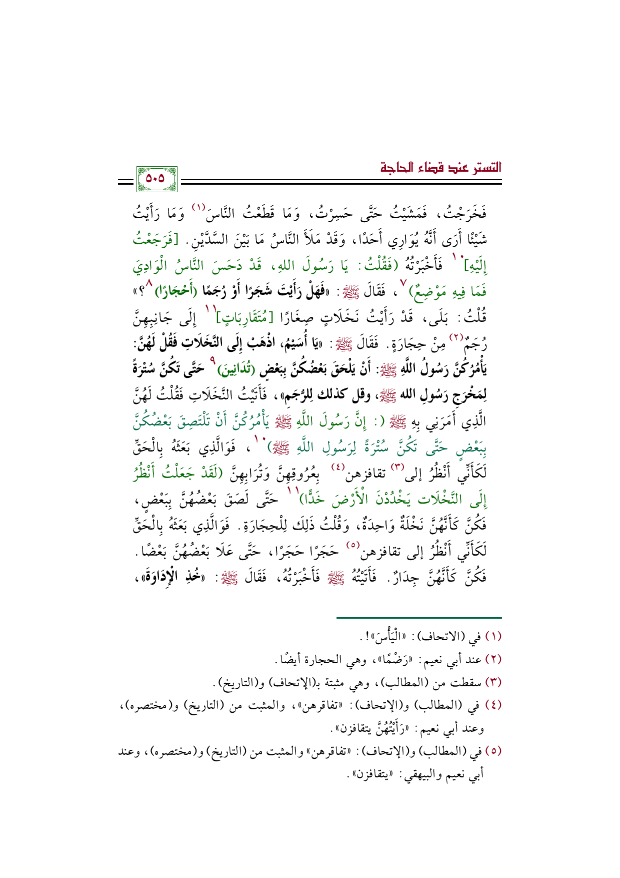 فَخَرَجْتُ، فَمَشَيْتُ حَتَّى حَسِرْتُ، وَمَا قَطَعْتُ النَّاسَ (¬١) وَمَا رَأَيْتُ شَيْئًا أَرَى أَنَّهُ يُوَارِي أَحَدًا، وَقَدْ مَلَأَ النَّاسُ مَا بَيْنَ السَّدَّيْنِ. [فَرَجَعْتُ إِلَيْهِ] ١٠ فَأَخْبَرْتُهُ (فَقُلْتُ: يَا رَسُولَ اللهِ، قَدْ دَحَسَ النَّاسُ الْوَادِيَ فَمَا فِيهِ مَوْضِعٌ) ٧، فَقَالَ صَلَّى اللَّهُ عَلَيْهِ وَسَلَّمَ: «فَهَلْ رَأَيْتَ شَجَرًا أَوْ رُجَمًا (أَحْجَارًا) ٨؟ » قُلْتُ: بَلَى، قَدْ رَأَيْتُ نَخَلَاتٍ صِغَارًا] مُتَقَارِبَاتٍ] ١١ إِلَى جَانِبِهِنَّ رُجَمٌ (¬٢) مِنْ حِجَارَةٍ.