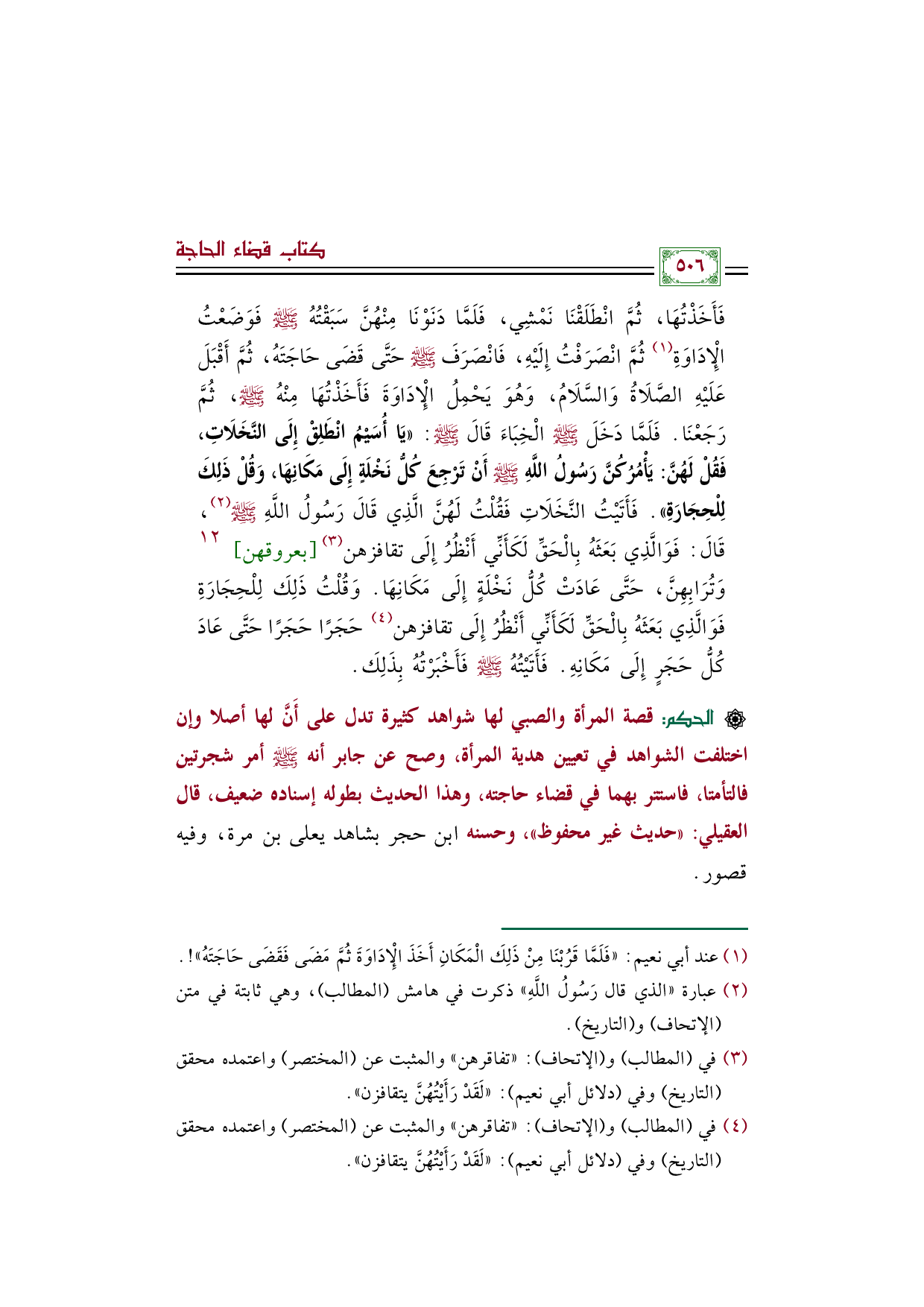 (¬١) - عند أبي نعيم: "فَلَمَّا قَرُبْنَا مِنْ ذَلِكَ الْمَكَانِ أَخَذَ الْإِدَاوَةَ ثُمَّ مَضَى فَقَضَى حَاجَتَهُ"! .