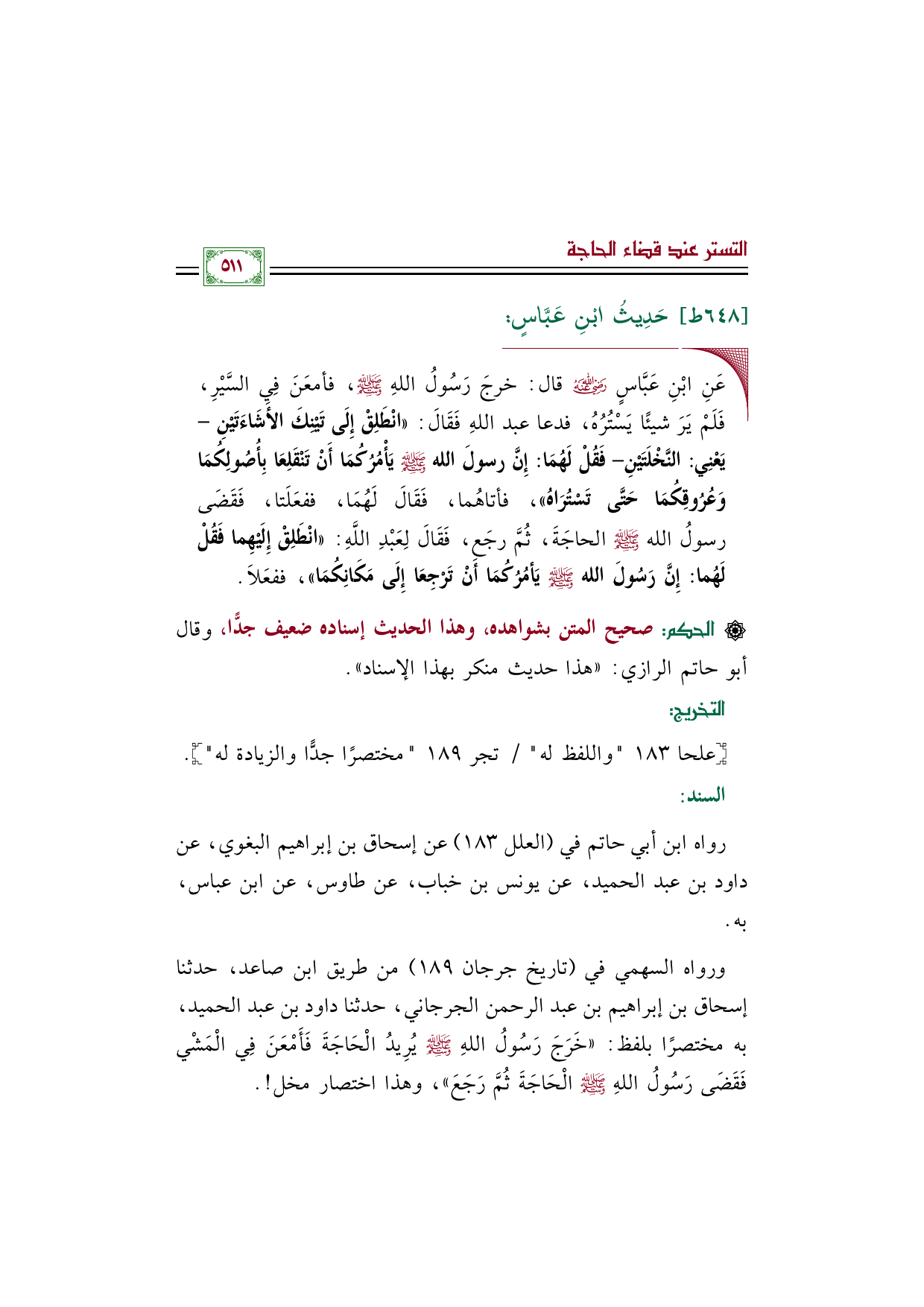 ورواه السهمي في (تاريخ جرجان ١٨٩) من طريق ابن صاعد، حدثنا إسحاق بن إبراهيم بن عبد الرحمن الجرجاني، حدثنا داود بن عبد الحميد، به مختصرًا بلفظ: "خَرَجَ رَسُولُ اللهِ صلى الله عليه وسلم يُرِيدُ الْحَاجَةَ فَأَمْعَنَ فِي الْمَشْي فَقَضَى رَسُولُ اللهِ صلى الله عليه وسلم الْحَاجَةَ ثُمَّ رَجَعَ"، وهذا اختصار مخل! .