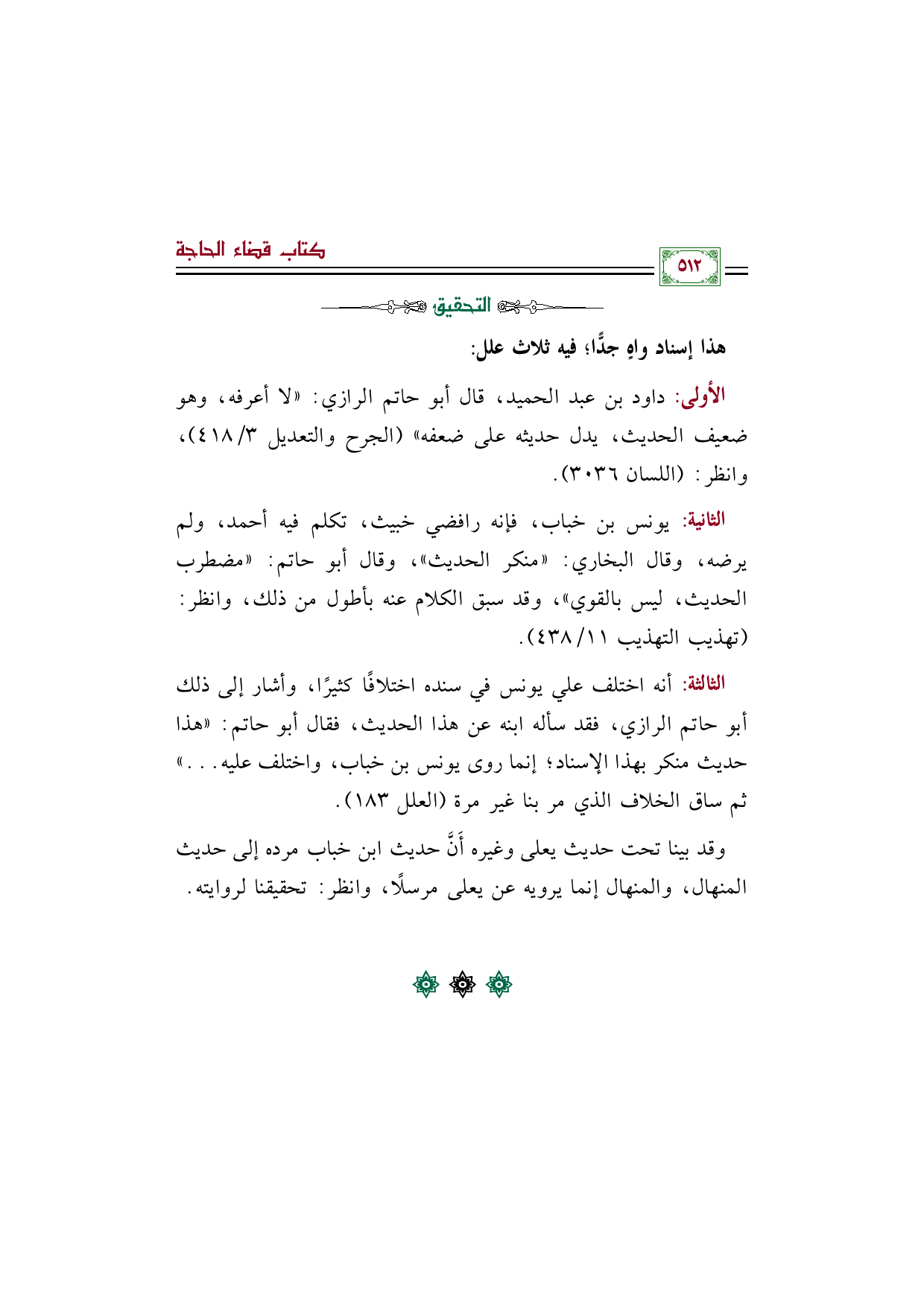 الثانية: يونس بن خباب، فإنه رافضي خبيث، تكلم فيه أحمد، ولم يرضه، وقال البخاري: "منكر الحديث"، وقال أبو حاتم: "مضطرب الحديث، ليس بالقوي"، وقد سبق الكلام عنه بأطول من ذلك، وانظر: (تهذيب التهذيب ١١/ ٤٣٨).