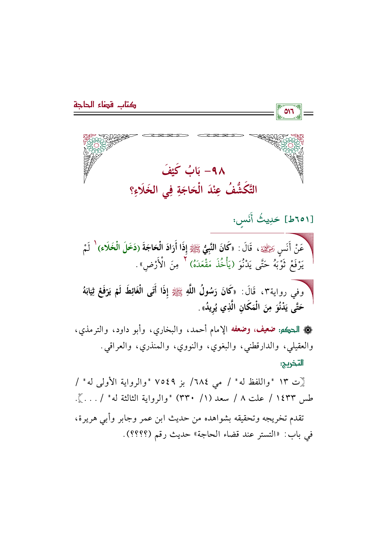 ◼ عَنْ أَنَسٍ رضي الله عنه، قَالَ: «كَانَ النَّبِيُّ صلى الله عليه وسلم إِذَا أَرَادَ الْحَاجَةَ (دَخَلَ الْخَلَاء) ١ لَمْ يَرْفَعْ ثَوْبَهُ حَتَّى يَدْنُوَ (يَأْخُذَ مَقْعَدَهُ) ٢ مِنَ الْأَرْضِ».