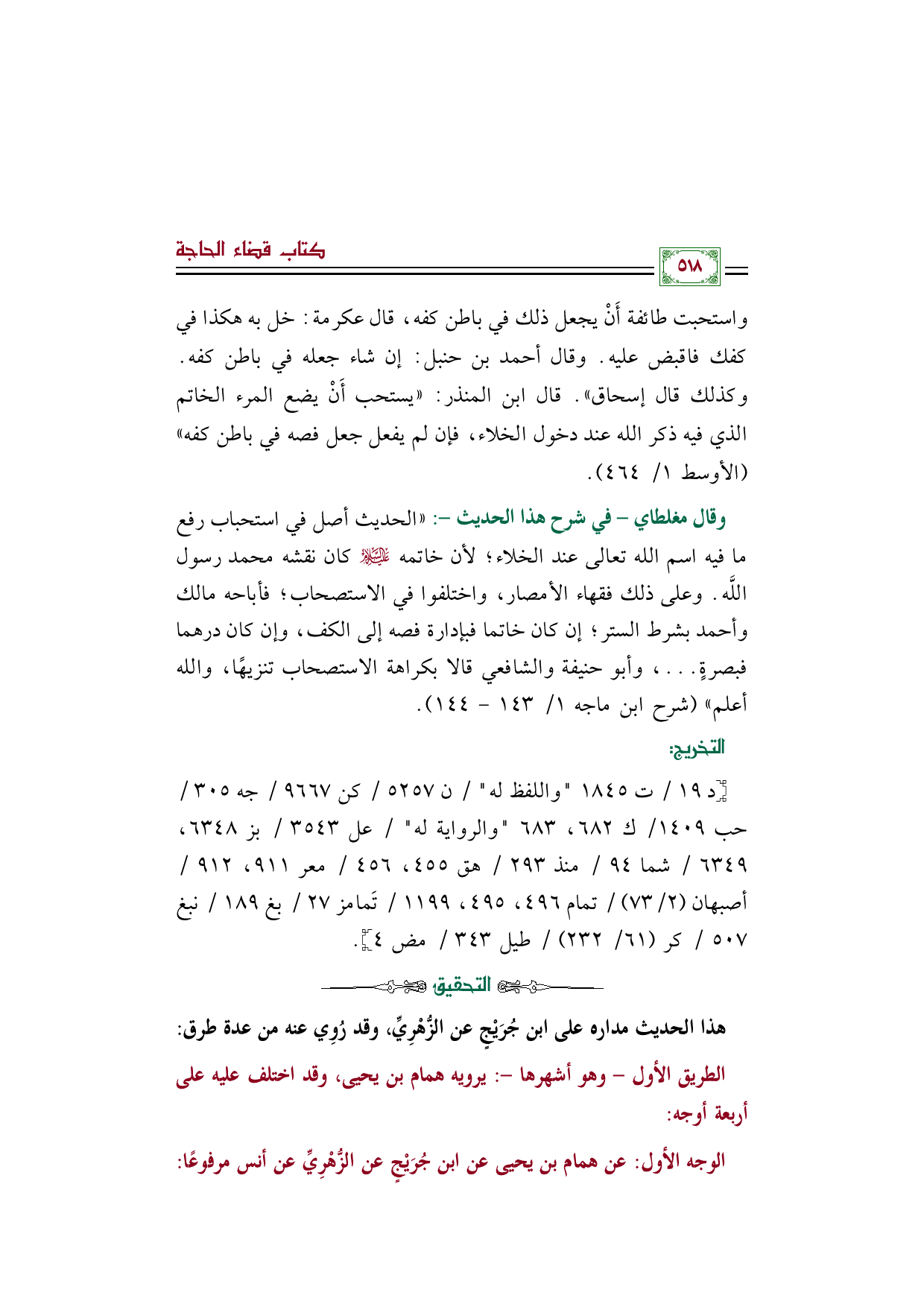 وقال مغلطاي - في شرح هذا الحديث -: "الحديث أصل في استحباب رفع ما فيه اسم الله تعالى عند الخلاء؛ لأن خاتمه عليه السلام كان نقشه محمد رسول اللَّه. وعلى ذلك فقهاء الأمصار، واختلفوا في الاستصحاب؛ فأباحه مالك وأحمد بشرط الستر؛ إن كان خاتما فبإدارة فصه إلى الكف، وإن كان درهما فبصرةٍ ... ، وأبو حنيفة والشافعي قالا بكراهة الاستصحاب تنزيهًا، والله أعلم" (شرح ابن ماجه ١/ ١٤٣ - ١٤٤).