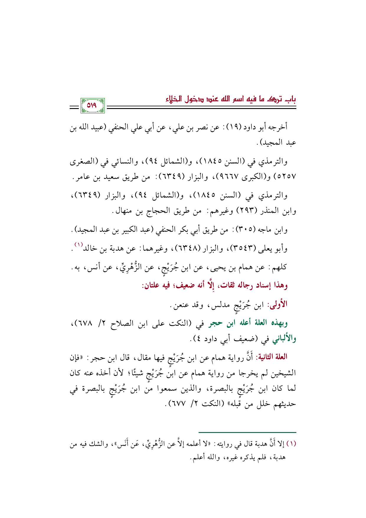 وبهذه العلة أعله ابن حجر في (النكت على ابن الصلاح ٢/ ٦٧٨)، والألباني في (ضعيف أبي داود ٤).