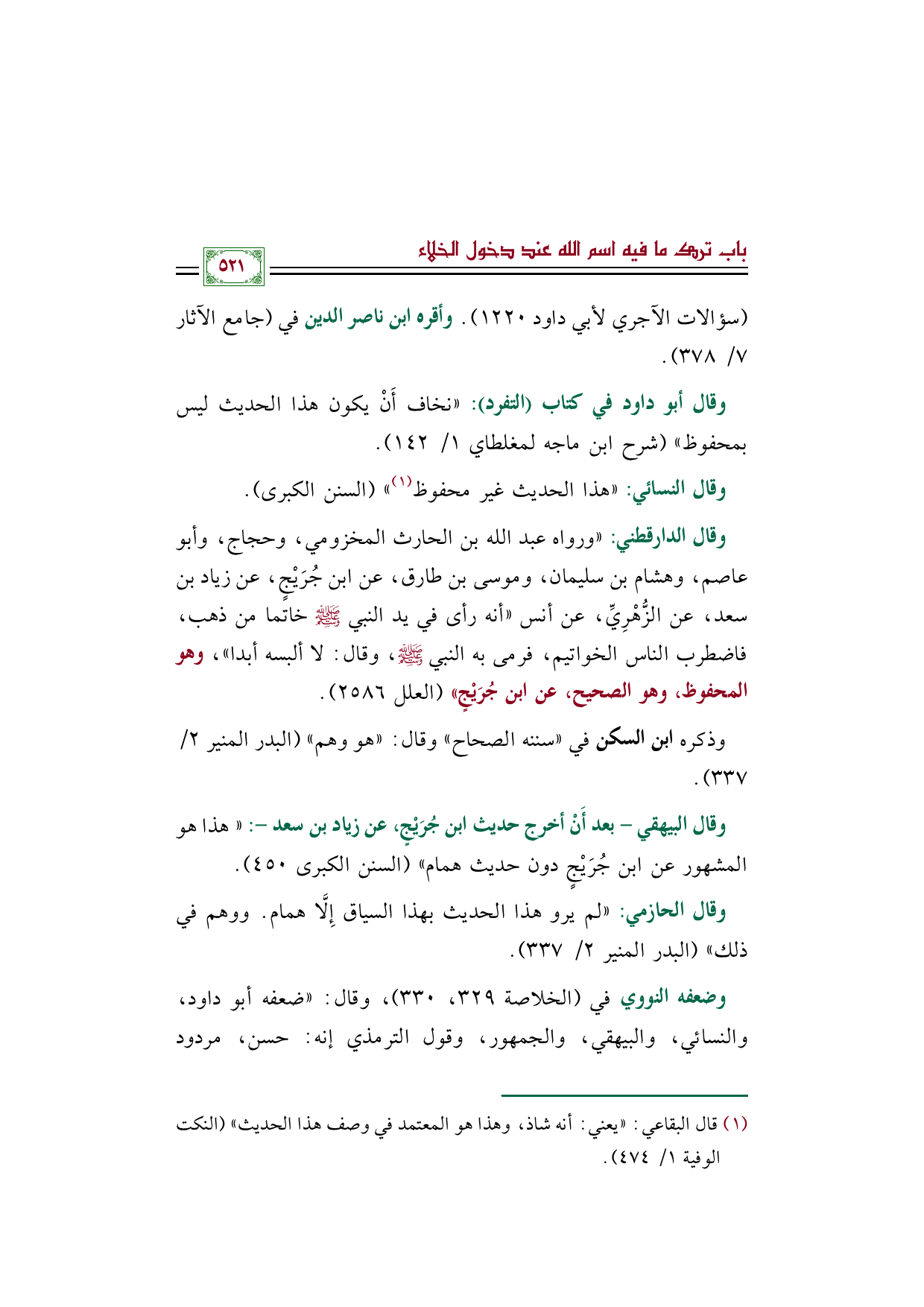 (سؤالات الآجري لأبي داود ١٢٢٠). وأقره ابن ناصر الدين في (جامع الآثار ٧/ ٣٧٨).