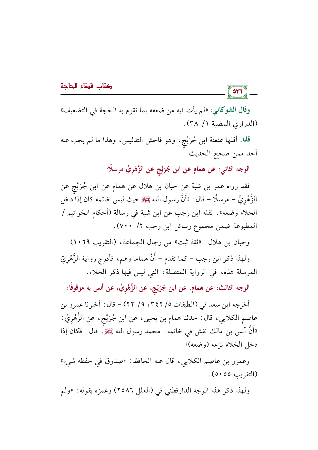 ولهذا ذكر ابن رجب - كما تقدم - أَنَّ هماما وهم، فأدرج رواية الزُّهْرِيّ المرسلة هذه، في الرواية المتصلة، التي ليس فيها ذكر الخلاء.