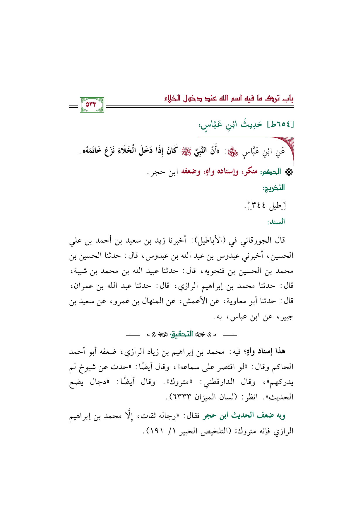 وبه ضعف الحديث ابن حجر فقال: "رجاله ثقات، إِلَّا محمد بن إبراهيم الرازي فإنه متروك" (التلخيص الحبير ١/ ١٩١).