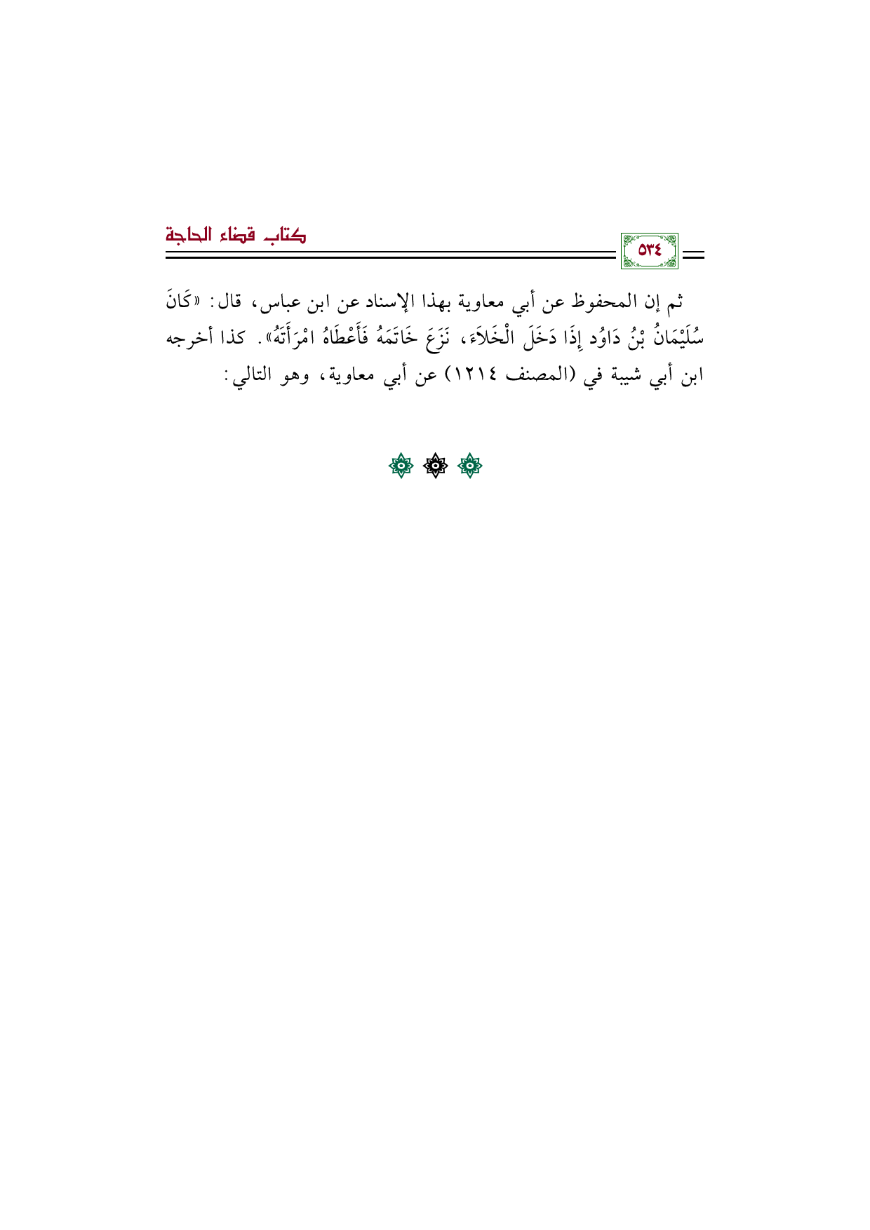 ثم إن المحفوظ عن أبي معاوية بهذا الإسناد عن ابن عباس، قال: «كَانَ سُلَيْمَانُ بْنُ دَاوُد إِذَا دَخَلَ الْخَلاءَ، نَزَعَ خَاتَمَهُ فَأَعْطَاهُ امْرَأَتَهُ». كذا أخرجه ابن أبي شيبة في (المصنف ١٢١٤) عن أبي معاوية، وهو التالي: