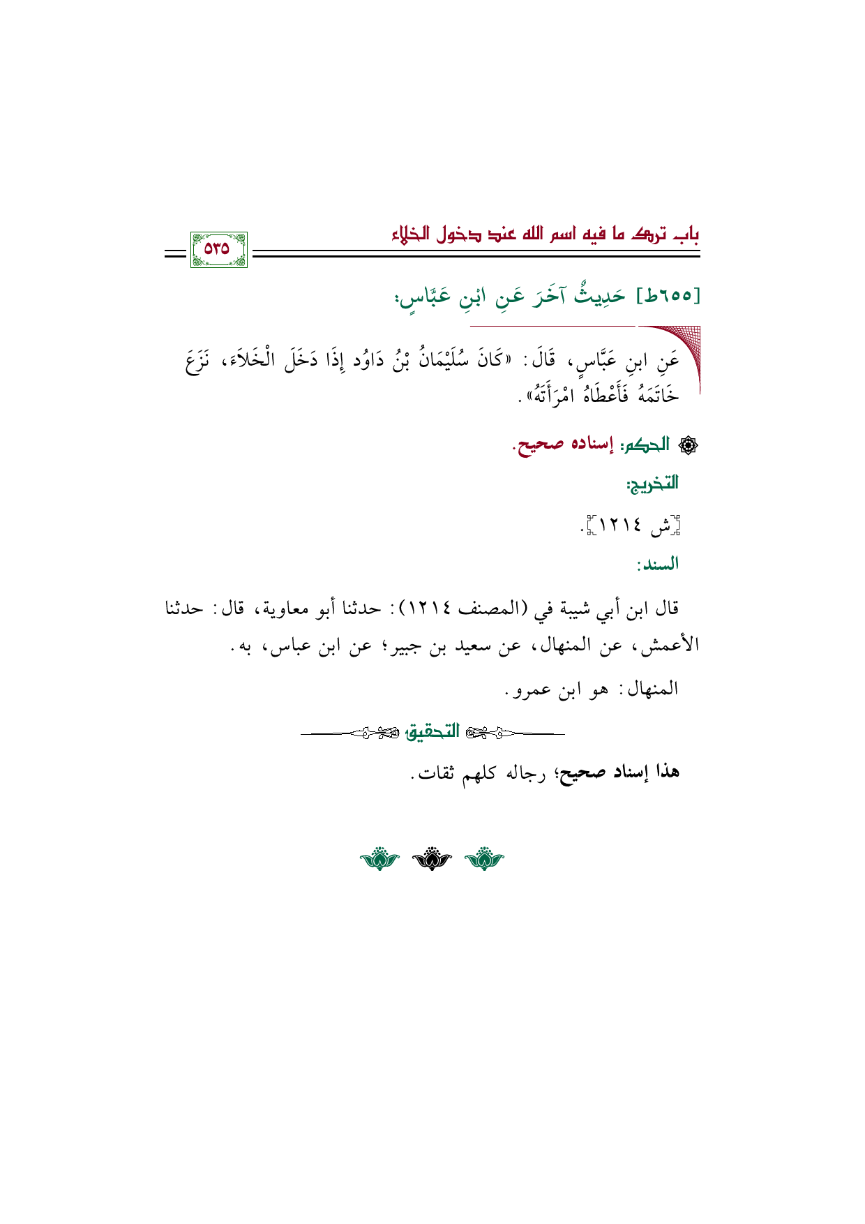 ◼ عَنِ ابنِ عَبَّاسٍ، قَالَ: «كَانَ سُلَيْمَانُ بْنُ دَاوُد إِذَا دَخَلَ الْخَلاءَ، نَزَعَ خَاتَمَهُ فَأَعْطَاهُ امْرَأَتَهُ».