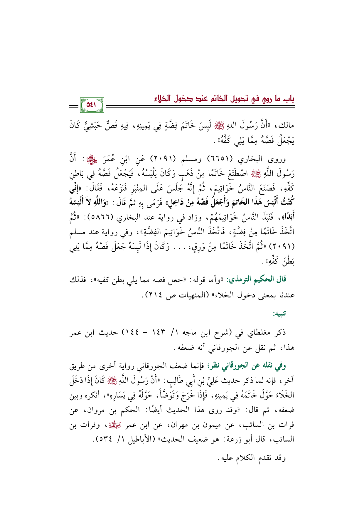 وفي نقله عن الجورقاني نظر؛ فإنما ضعف الجورقاني رواية أخرى من طريق آخر، فإنه لما ذكر حديث عَلِيِّ بْنِ أَبِي طَالِبٍ: «أَنّ رَسُولَ اللَّهِ صلى الله عليه وسلم كَانَ إِذَا دَخَلَ الخَلَاءَ حَوَّلَ خَاتَمَهُ فِي يَمِينِهِ، فَإِذَا خَرَجَ وَتَوَضَّأَ، حَوَّلَهُ فِي يَسَارِهِ»، أنكره وبين ضعفه، ثم قال: "وقد روى هذا الحديث أيضًا: الحكم بن مروان، عن فرات بن السائب، عن ميمون بن مهران، عن ابن عمر رضي الله عنه، وفرات بن السائب، قال أبو زرعة: هو ضعيف الحديث" (الأباطيل ١/ ٥٣٤).