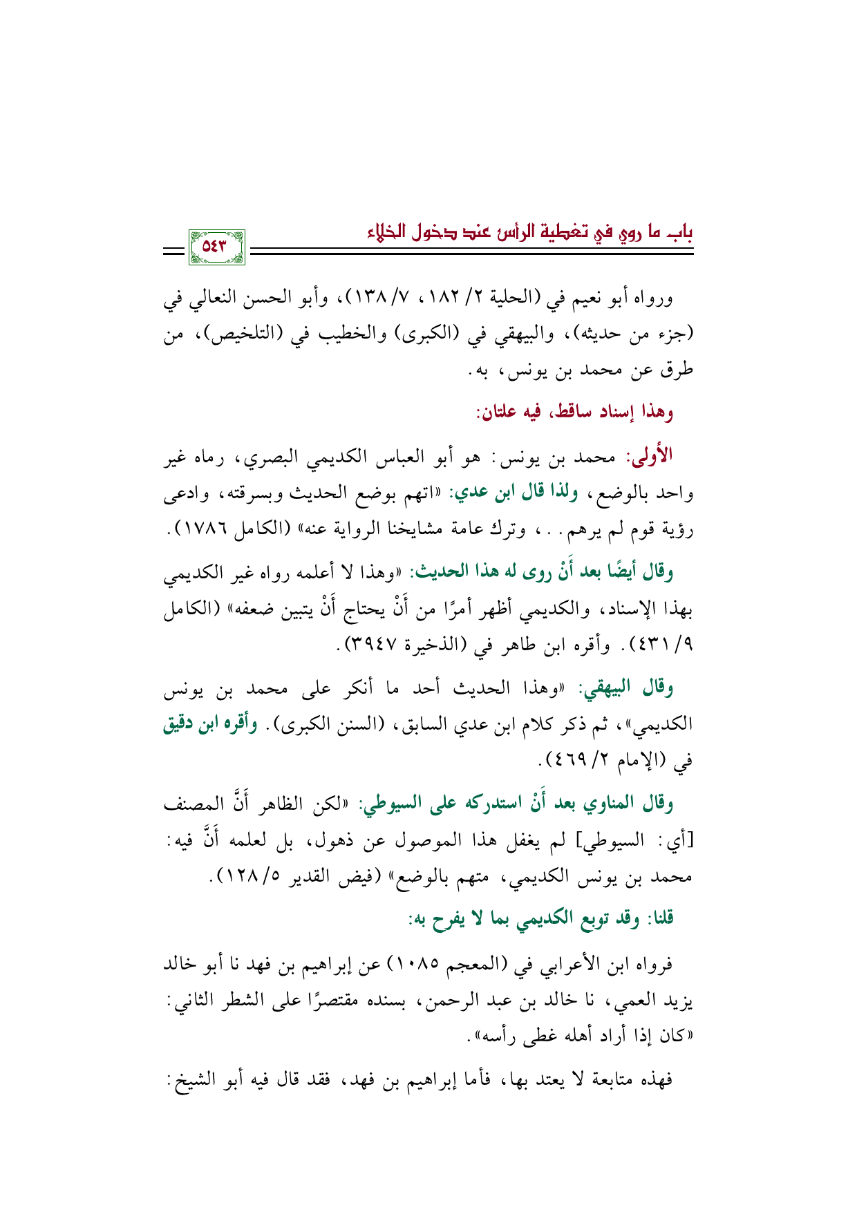 وقال المناوي بعد أَنْ استدركه على السيوطي: "لكن الظاهر أَنَّ المصنف [أي: السيوطي] لم يغفل هذا الموصول عن ذهول، بل لعلمه أَنَّ فيه: محمد بن يونس الكديمي، متهم بالوضع" (فيض القدير ٥/ ١٢٨).