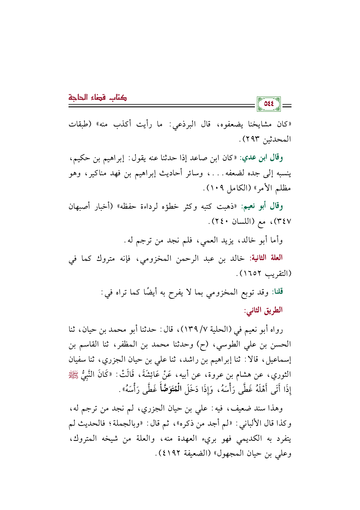 رواه أبو نعيم في (الحلية ٧/ ١٣٩)، قال: حدثنا أبو محمد بن حيان، ثنا الحسن بن علي الطوسي، (ح) وحدثنا محمد بن المظفر، ثنا القاسم بن إسماعيل، قالا: ثنا إبراهيم بن راشد، ثنا علي بن حيان الجزري، ثنا سفيان الثوري، عن هشام بن عروة، عن أبيه، عَنْ عَائِشَةَ، قَالَتْ: «كَانَ النَّبِيُّ صَلَّى اللهُ عَلَيْهِ وَسَلَّمَ إِذَا أَتَى أَهْلَهُ غَطَّى رَأْسَهُ، وَإِذَا دَخَلَ الْمُتَوَضَّأَ غَطَّى رَأْسَهُ».