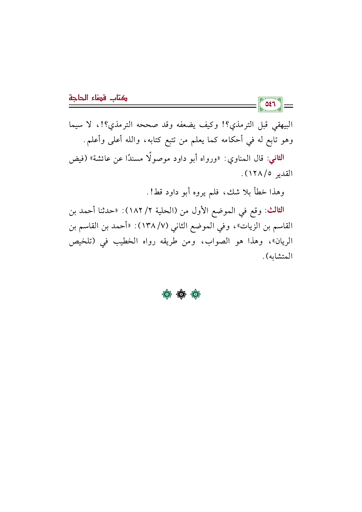 البيهقي قبل الترمذي؟! وكيف يضعفه وقد صححه الترمذي؟!، لا سيما وهو تابع له في أحكامه كما يعلم من تتبع كتابه، والله أعلى وأعلم.