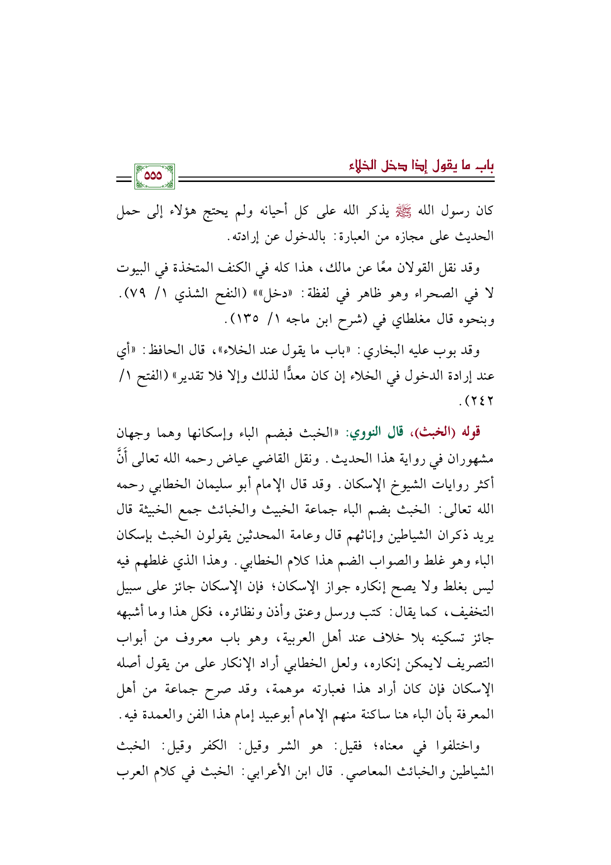 * قوله (الخبث)، قال النووي: "الخبث فبضم الباء وإسكانها وهما وجهان مشهوران في رواية هذا الحديث. ونقل القاضي عياض رحمه الله تعالى أَنَّ أكثر روايات الشيوخ الإسكان. وقد قال الإمام أبو سليمان الخطابي رحمه الله تعالى: الخبث بضم الباء جماعة الخبيث والخبائث جمع الخبيثة قال يريد ذكران الشياطين وإناثهم قال وعامة المحدثين يقولون الخبث بإسكان الباء وهو غلط والصواب الضم هذا كلام الخطابي. وهذا الذي غلطهم فيه ليس بغلط ولا يصح إنكاره جواز الإسكان؛ فإن الإسكان جائز على سبيل التخفيف، كما يقال: كتب ورسل وعنق وأذن ونظائره، فكل هذا وما أشبهه جائز تسكينه بلا خلاف عند أهل العربية، وهو باب معروف من أبواب التصريف لايمكن إنكاره، ولعل الخطابي أراد الإنكار على من يقول أصله الإسكان فإن كان أراد هذا فعبارته موهمة، وقد صرح جماعة من أهل المعرفة بأن الباء هنا ساكنة منهم الإمام أبوعبيد إمام هذا الفن والعمدة فيه.