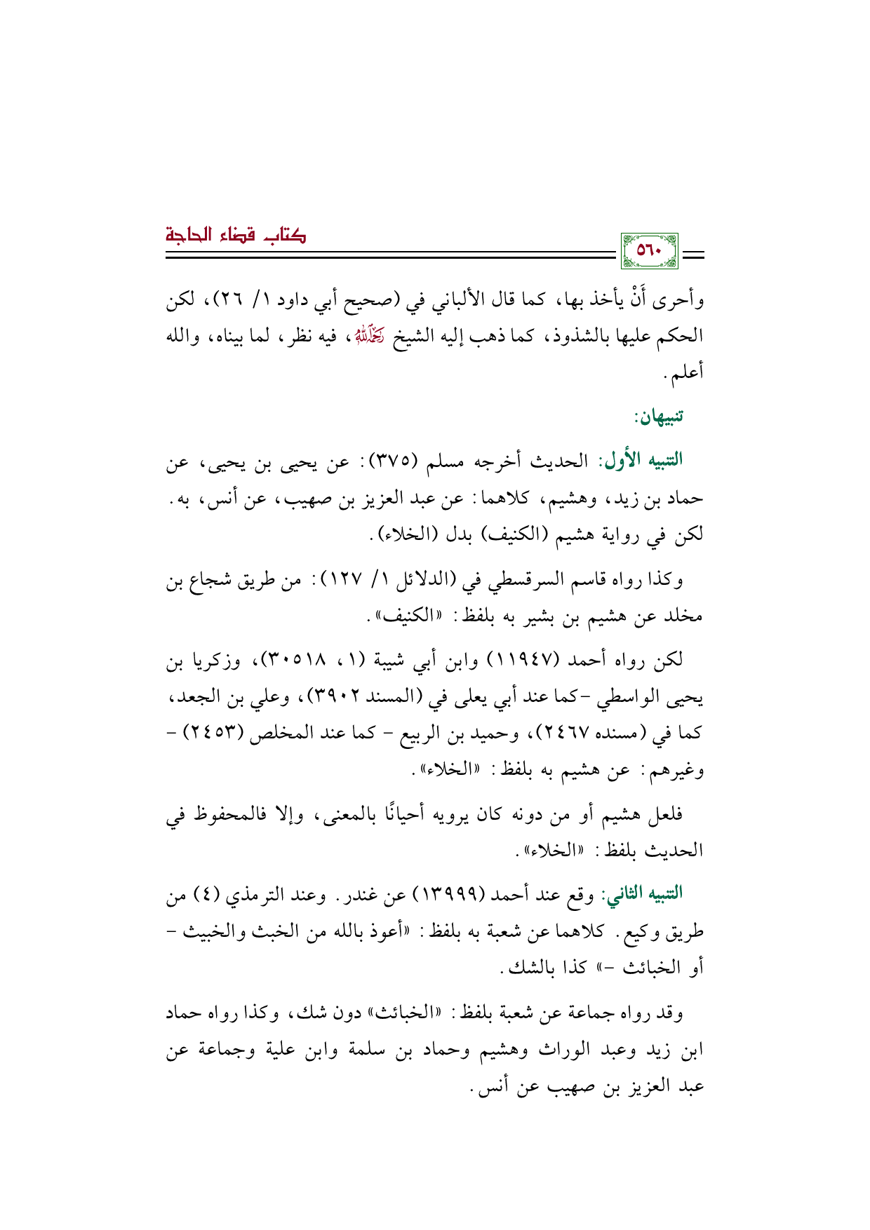 التنبيه الأول: الحديث أخرجه مسلم (٣٧٥): عن يحيى بن يحيى، عن حماد بن زيد، وهشيم، كلاهما: عن عبد العزيز بن صهيب، عن أنس، به. لكن في رواية هشيم (الكنيف) بدل (الخلاء).
