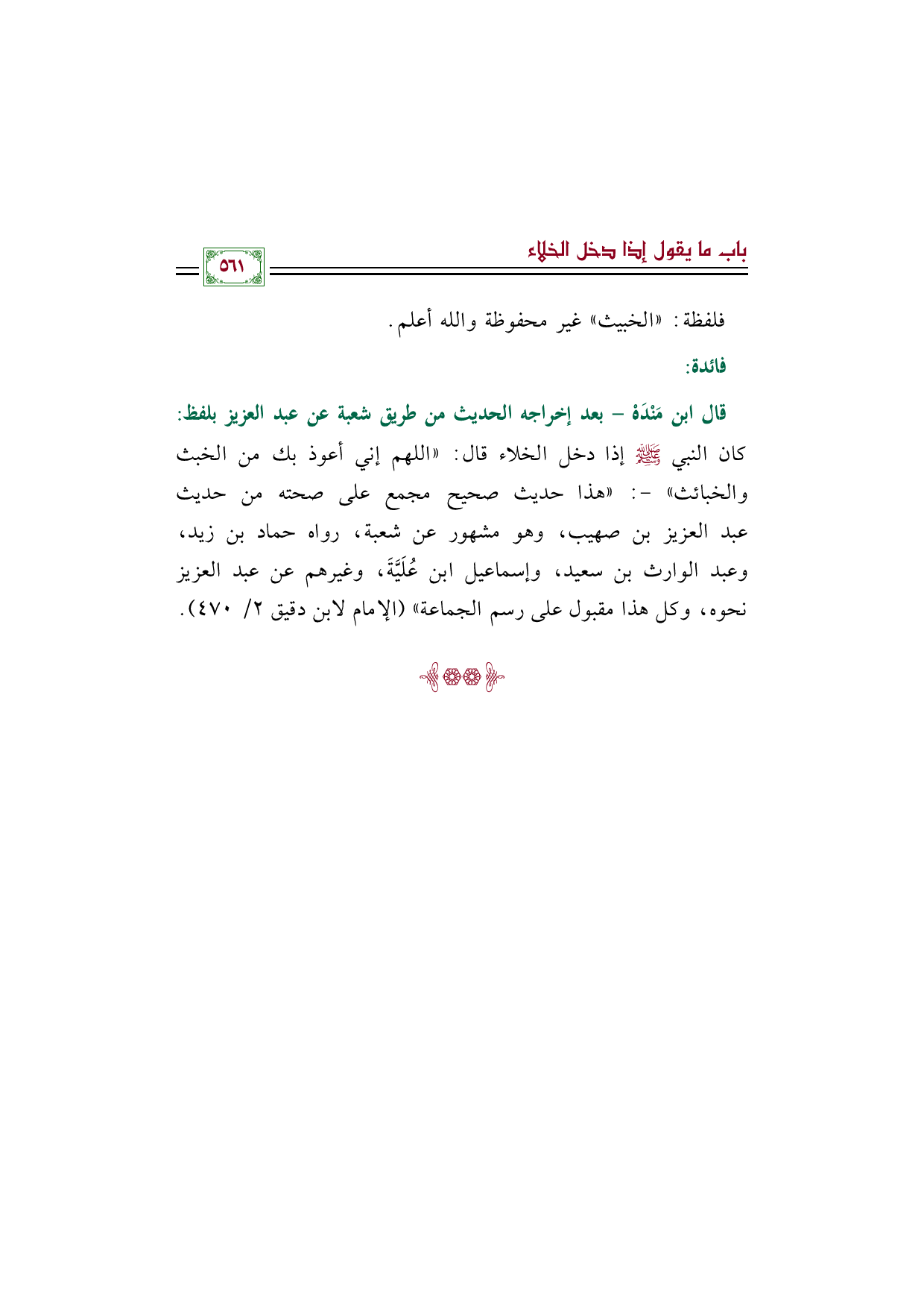 قال ابن مَنْدَهْ - بعد إخراجه الحديث من طريق شعبة عن عبد العزيز بلفظ: كان النبي صلى الله عليه وسلم إذا دخل الخلاء قال: «اللهم إني أعوذ بك من الخبث والخبائث» -: "هذا حديث صحيح مجمع على صحته من حديث عبد العزيز بن صهيب، وهو مشهور عن شعبة، رواه حماد بن زيد، وعبد الوارث بن سعيد، وإسماعيل ابن عُلَيَّةَ، وغيرهم عن عبد العزيز نحوه، وكل هذا مقبول على رسم الجماعة" (الإمام لابن دقيق ٢/ ٤٧٠).
