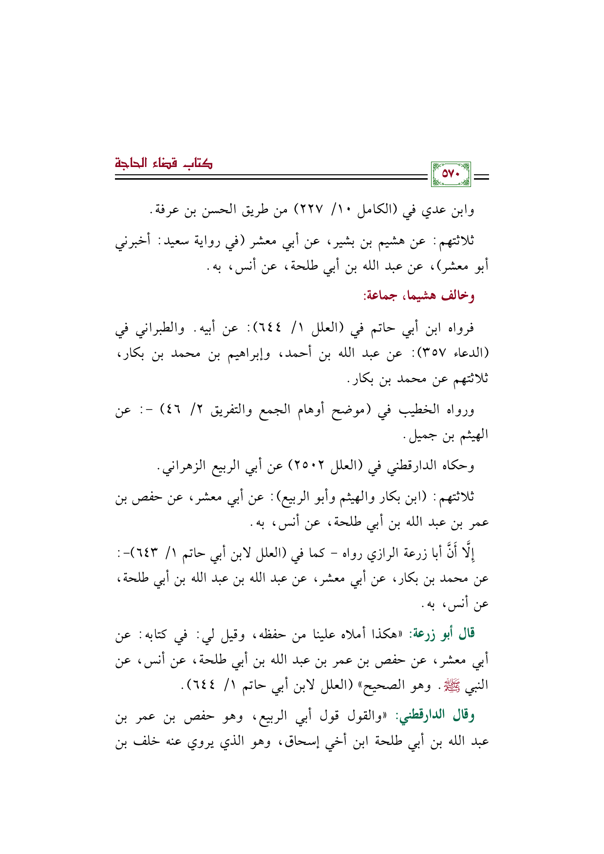 قال أبو زرعة: "هكذا أملاه علينا من حفظه، وقيل لي: في كتابه: عن أبي معشر، عن حفص بن عمر بن عبد الله بن أبي طلحة، عن أنس، عن النبي صلى الله عليه وسلم. وهو الصحيح" (العلل لابن أبي حاتم ١/ ٦٤٤).