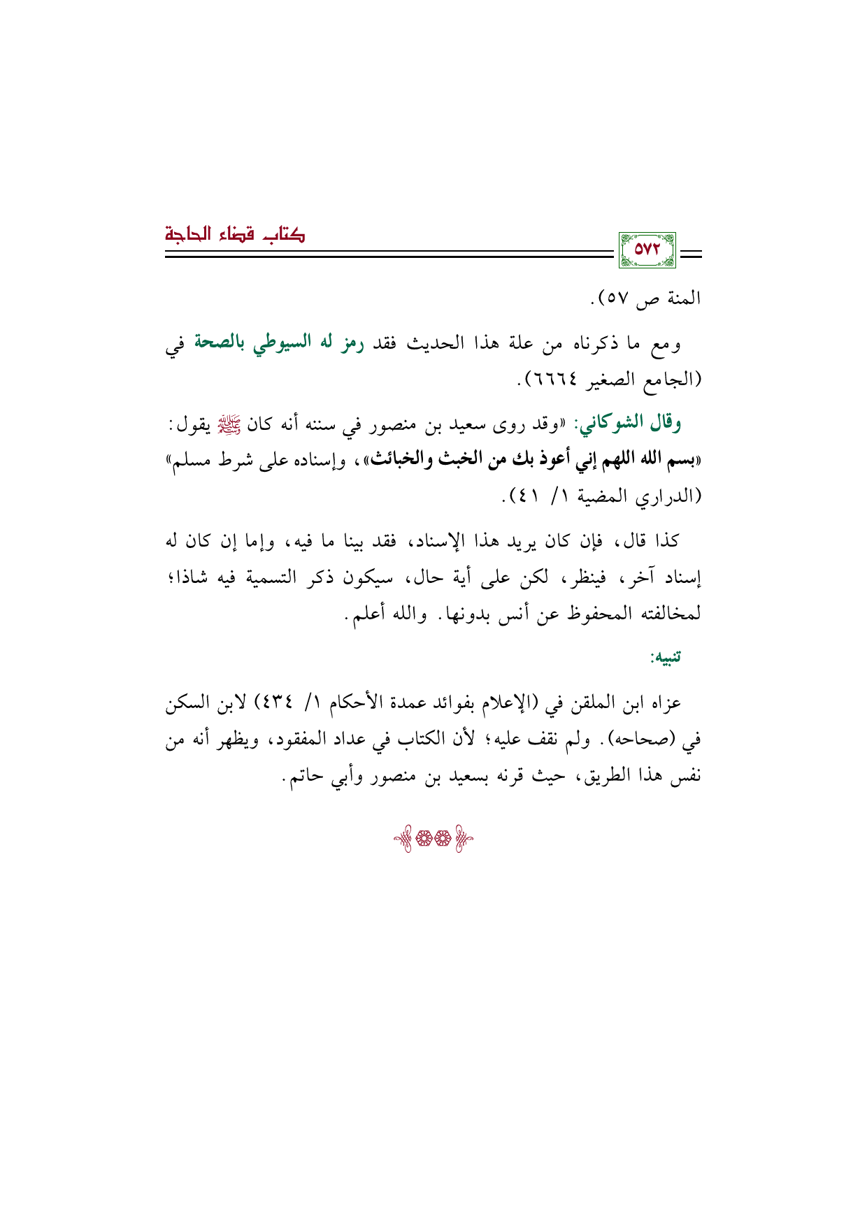 وقال الشوكاني: "وقد روى سعيد بن منصور في سننه أنه كان صلى الله عليه وسلم يقول: «بسم الله اللهم إني أعوذ بك من الخبث والخبائث»، وإسناده على شرط مسلم" (الدراري المضية ١/ ٤١).